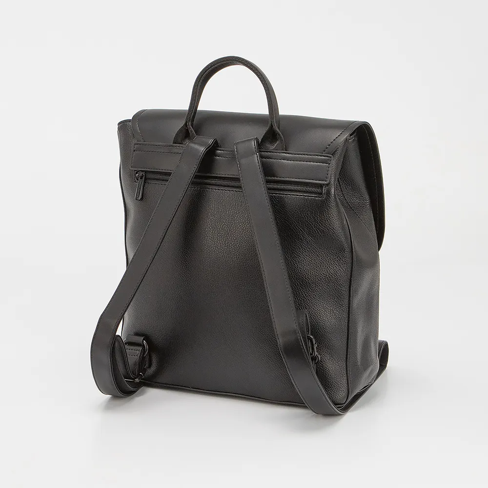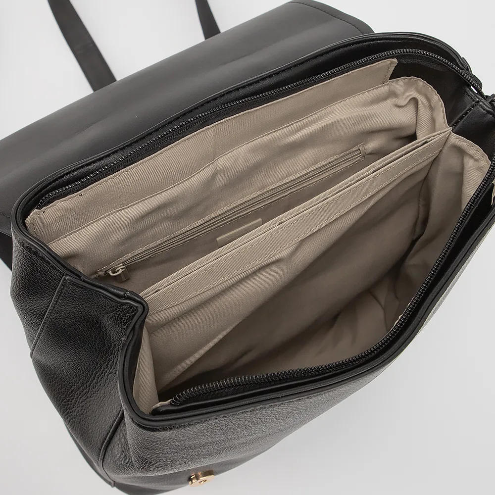 Рюкзак от торговой марки David Jones выполнен из искусственной кожи черного цвета. Модель с лямкой и двумя регулируемыми плечевыми ремнями. Клапан на двух магнитных кнопках закрывает отделение на молнии. Внутри: текстильная подкладка, карман на молнии, средник без застежки, накладной карман. На задней стороне - карман на молнии.