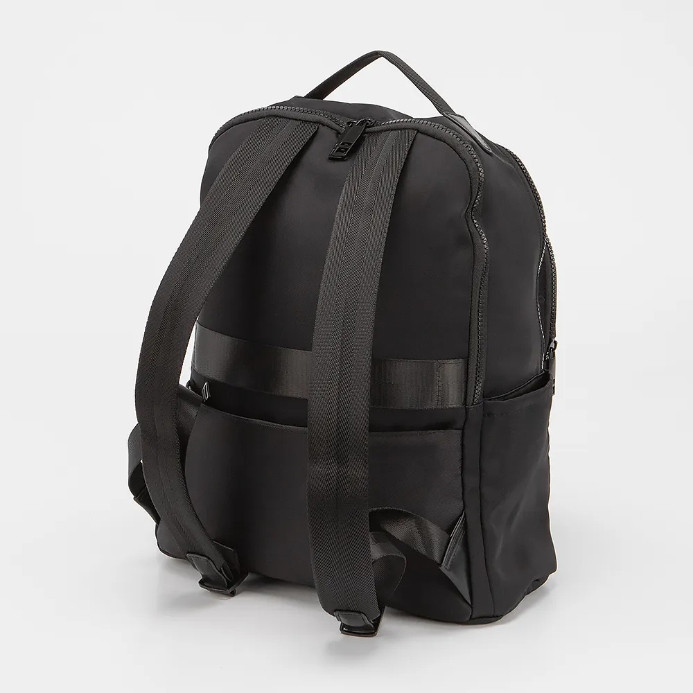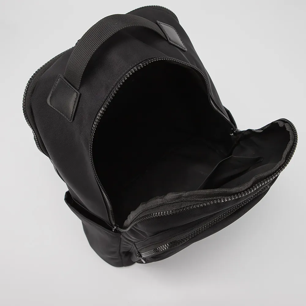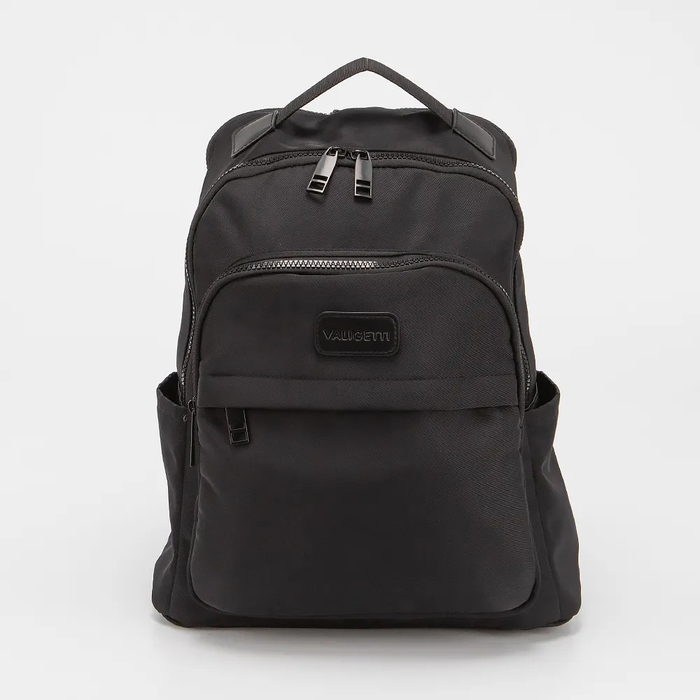 Рюкзак от торговой марки Valigetti выполнен из плотного текстильного материала черного цвета. Модель с ручкой и двумя регулируемыми плечевыми лямками. Два отделения на молнии. Внутри: текстильная подкладка. На лицевой стороне - два кармана на молнии. По бокам - карман без застежки. На задней стороне - карман на молнии и лямка для крепления на выдвижную ручку чемодана.