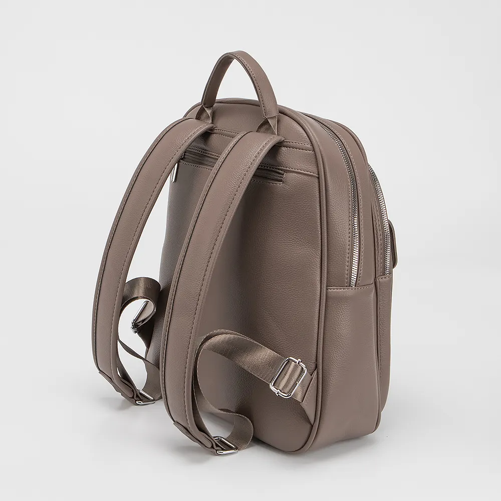 Рюкзак от торговой марки Valigetti выполнен из искусственной кожи кофейного цвета. Модель с ручкой и двумя регулируемыми плечевыми ремнями. Отделение на молнии. Внутри: текстильная подкладка. На лицевой стороне - карман на молнии и карман с клапаном. На задней стороне - карман на молнии.