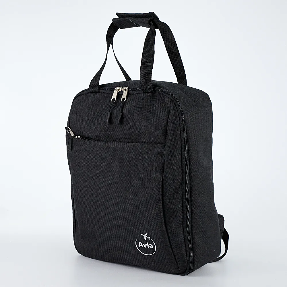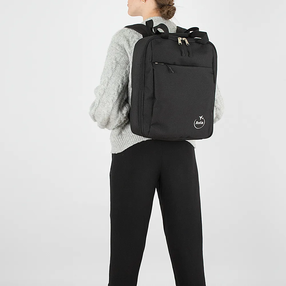 Находка для авиапутешествий – легкий практичный рюкзак от торговой марки Ecotope. Выполнен из прочной ткани черного цвета. Модель ве ртикальной ориентации, прямоугольной формы; с двумя удлиненными ручками с фиксатором на липучке, плечевыми лямками. Отделение на круговой молнии с двумя бегунками; широко раскрывается. Внутри: два кармана-сетки, карман-разделитель на молнии, отделение с фиксирующими ремнями. На передней стороне – карман на молнии. На задней стороне имеется шлевка для крепления на ручку чемодана. Размер рюкзака помещается в калибратор авиакомпании «Победа».