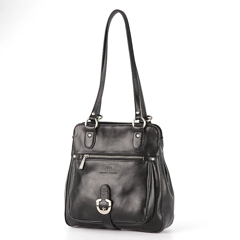 Сумка-рюкзак от торговой марки Francesco Molinary из натуральной кожи черного цвета. Модель с двумя удлиненными ручками, которые при стягивании превращаются в плечевые лямки. Отделение на молнии. Внутри: фирменная подкладка, средник и карман на молнии, два накладных кармана. На лицевой стороне – накладной карман на молнии с декоративным ремешком с пряжкой. На задней стороне – карман на молнии.