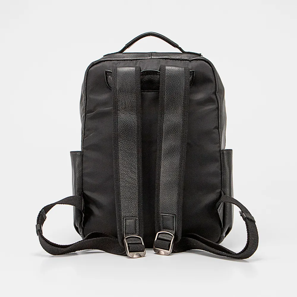 Рюкзак от торговой марки Poshete из натуральной кожи и практичного текстильного материала черного цвета. Модель с одной ручкой и регулируемыми плечевыми лямками. Отделение на молнии. Внутри: фирменная подкладка, накладной карман с уплотненной стенкой для ноутбука, накладной карман. На лицевой стороне – два кармана на молнии. По бокам – накладной карман без застежки.