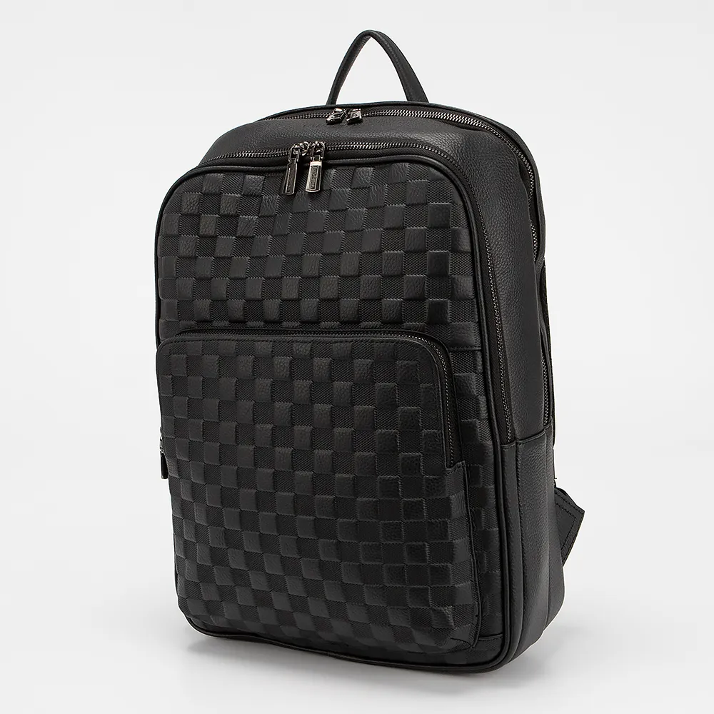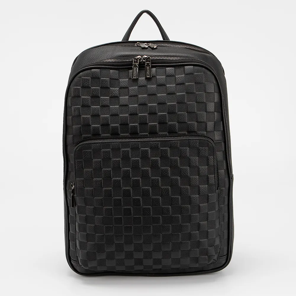 Рюкзак от торговой марки Valigetti из натуральной кожи черного цвета. Лицевая сторона декорирована тиснением с шахматным рисунком. Модель с лямкой-переноской и регулируемыми плечевыми лямками. Два отделения на молнии, с текстильной подкладкой. В основном отделении – накладной карман с уплотненной стенкой для ноутбука, карман на молнии. В переднем отделении – органайзер. На лицевой стороне – накладной карман на молнии. На спинке с верхним дышащим слоем имеется лямка для крепления на выдвижную ручку чемодана.