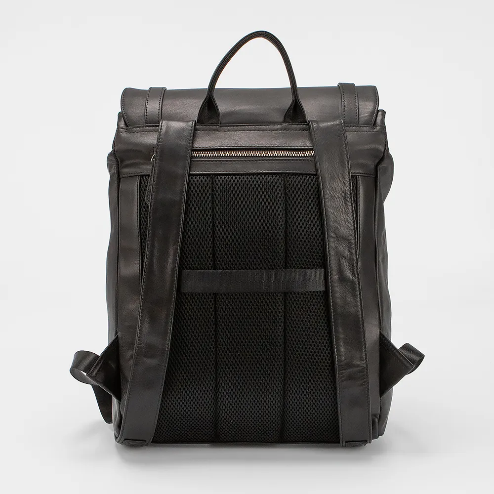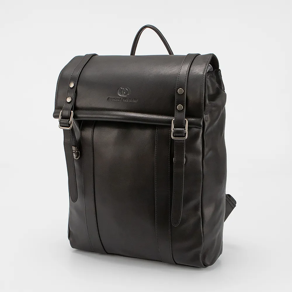 Рюкзак от торговой марки Francesco Molinary из натуральной кожи черного цвета. Модель с лямкой-переноской, регулируемыми плечевыми лямками. Закрывается коротким клапаном на цупферные замки; клапан декорирован ремешками; с внутренней стороны имеется бархатистая подкладка. Глубокое отделение на молнии. Внутри: карман на молнии, накладной карман с уплотненной стенкой для ноутбука, два накладных кармана. Спинка с дышащей сетчатой накладкой; имеется карман на молнии и лямка для крепления на выдвижную ручку чемодана.