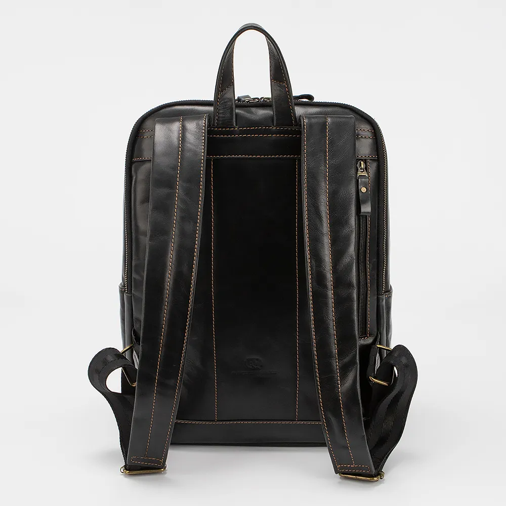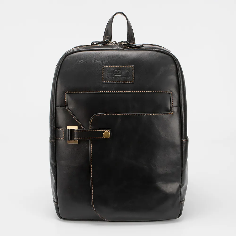 Рюкзак от торговой марки Francesco Molinary из натуральной кожи черного цвета с контрастной отстрочкой. Вместительная модель с лямкой-переноской, регулируемыми плечевыми ремнями. Два Отделения на молнии. Внутри: фирменная подкладка, накладной карман с уплотненной стенкой для ноутбука, два накладных кармана, карман на молнии. Лицевая сторона декорирована ремешком на кнопке. По бокам - накладные карманы без застежки. На спинке - вертикальный карман на молнии.