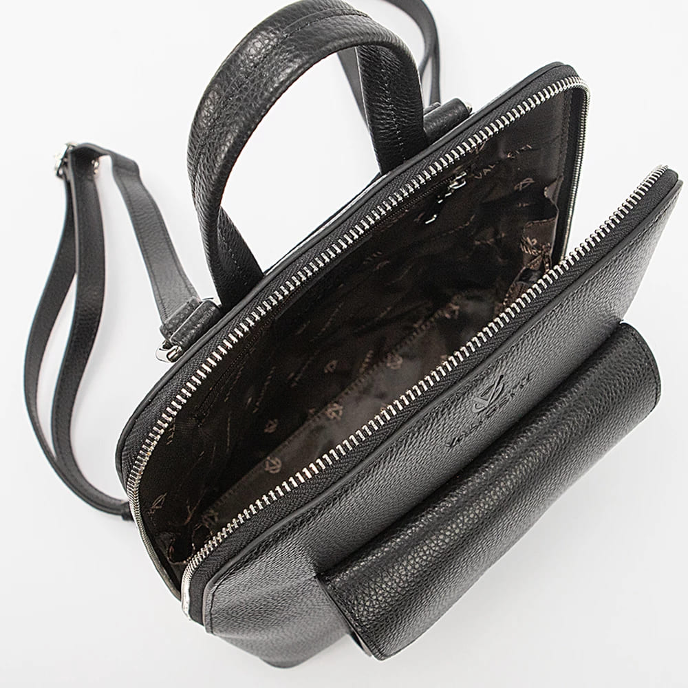 Рюкзак от Valigetti выполнен из натуральной кожи чёрного цвета. Он оснащён удобной лямкой для переноски и регулируемыми плечевыми лямками. Основное отделение закрывается на молнию с двумя встречными бегунками.