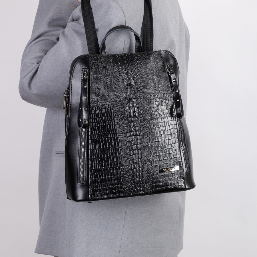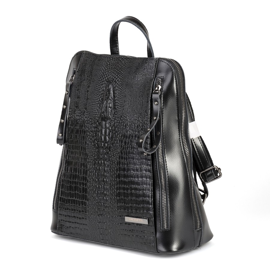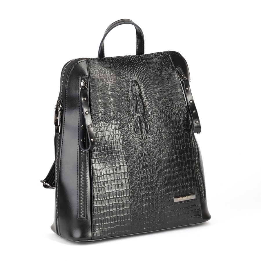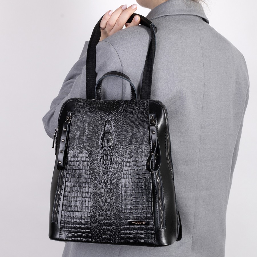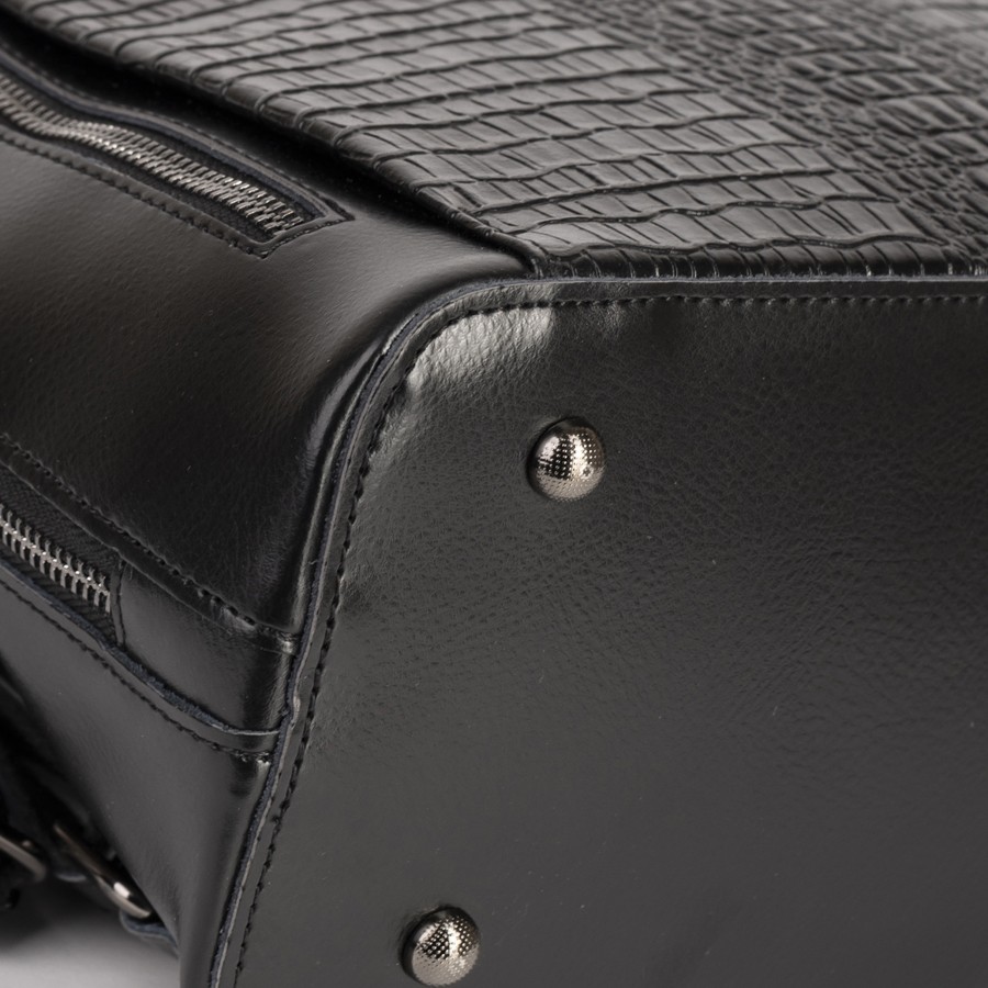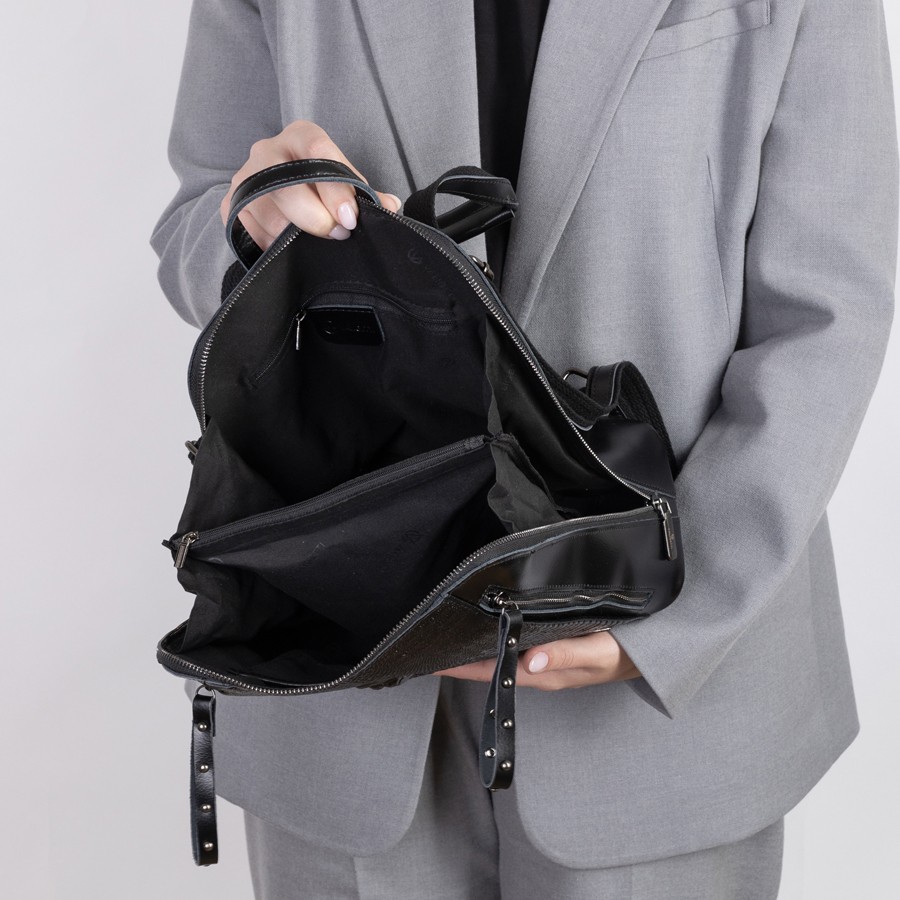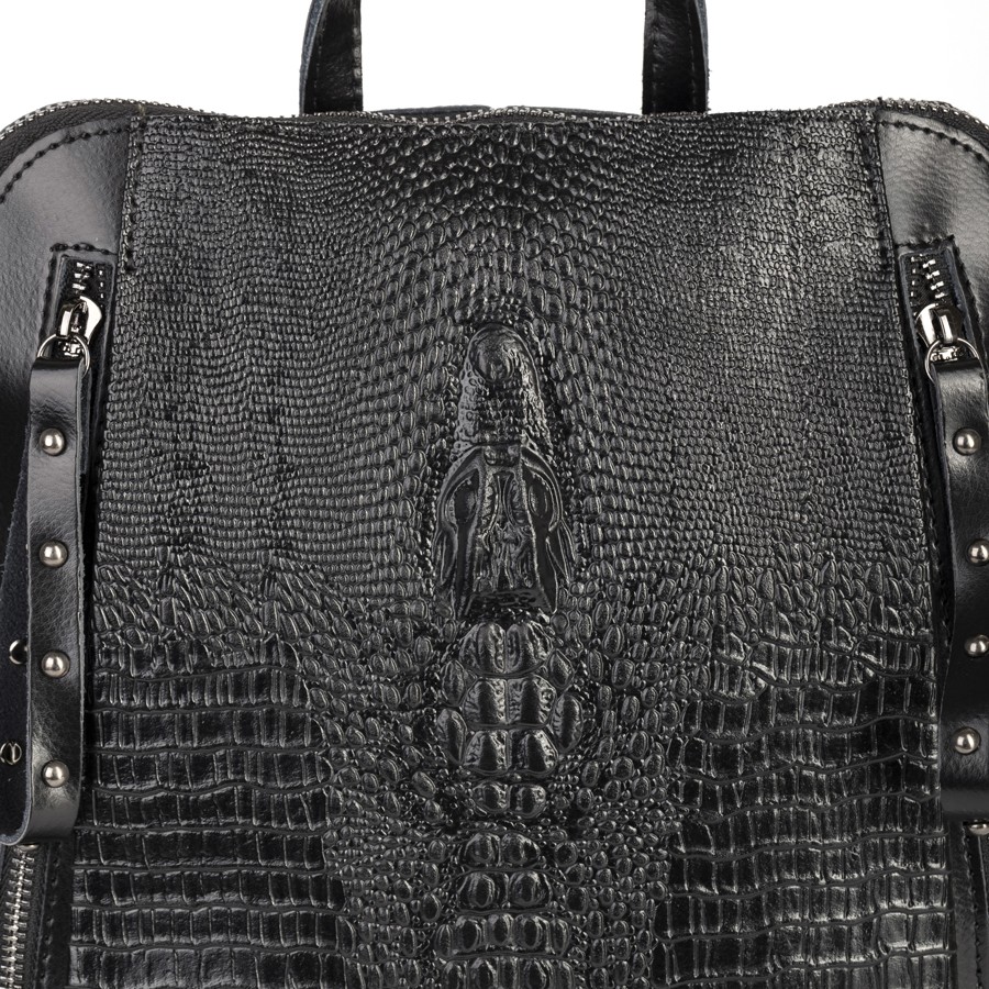 Женская сумка-рюкзак из чёрной кожи с фактурой под крокодила. Форма — строгая, с чёткими линиями и лёгким глянцевым блеском. Дизайн сочетает практичность и стиль, подходит для города и деловых встреч.