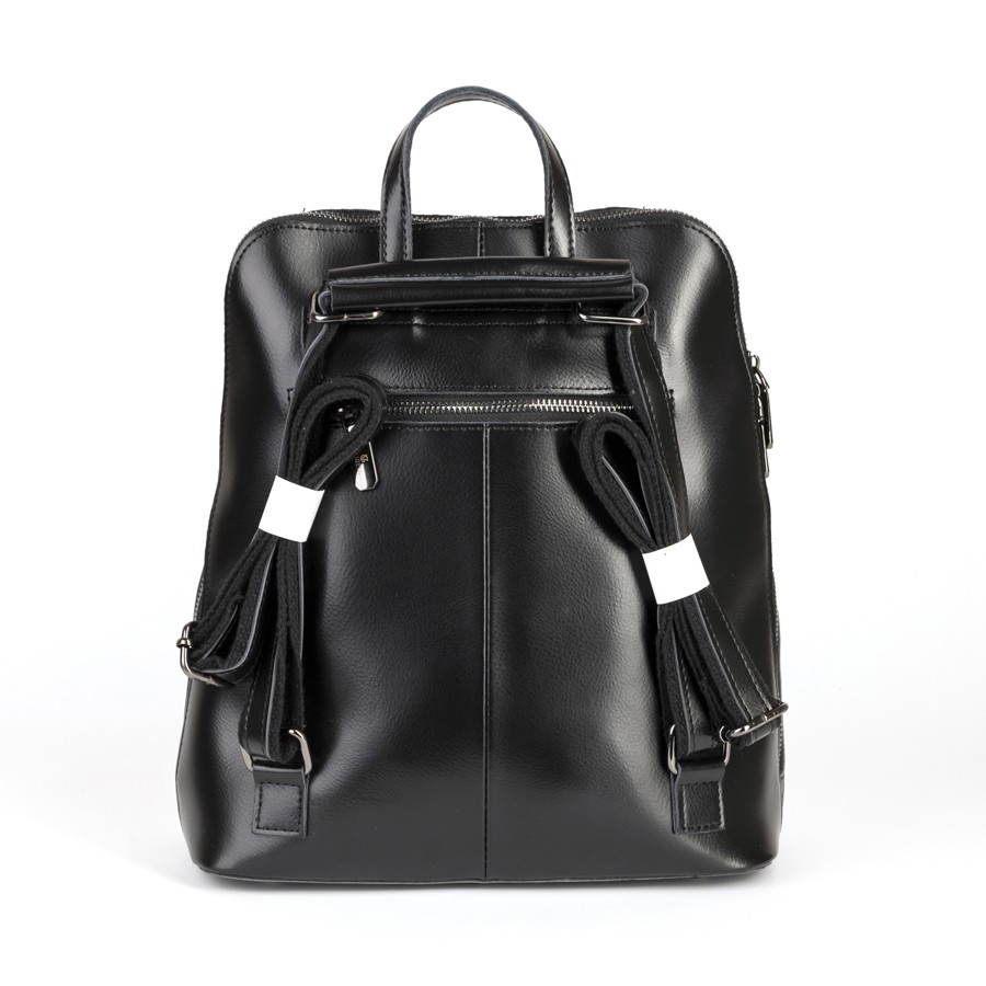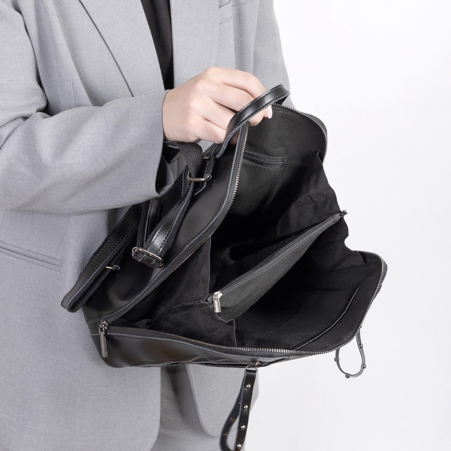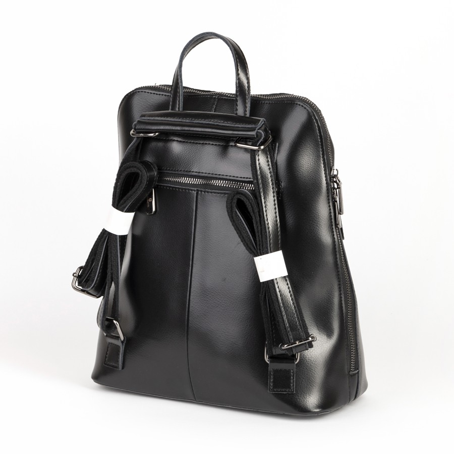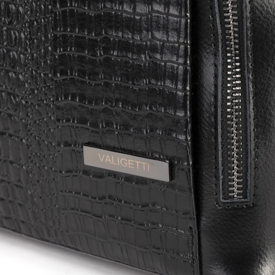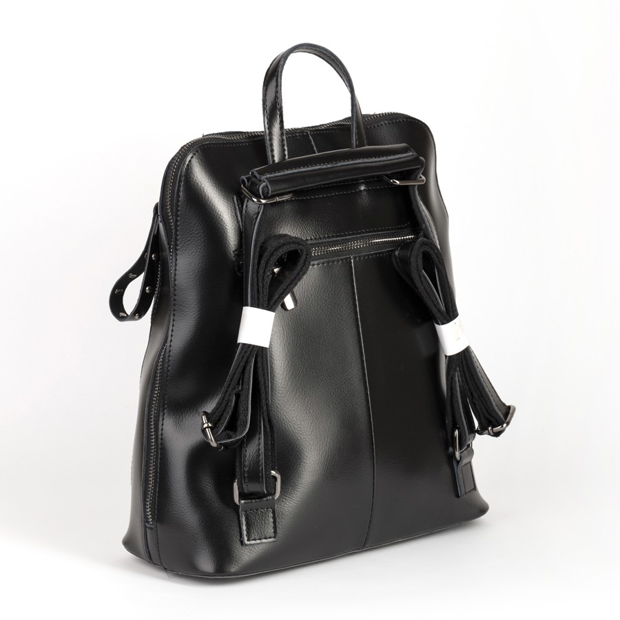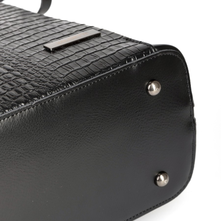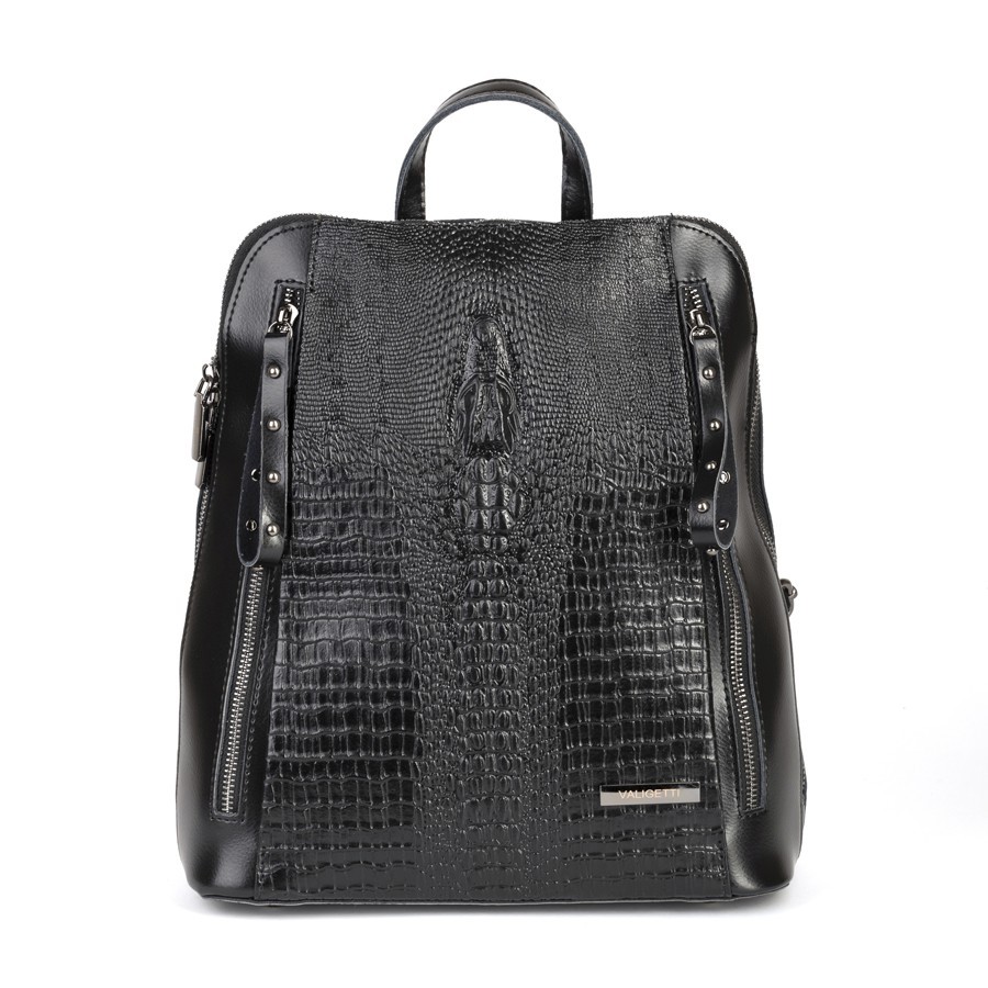 Женская сумка-рюкзак из чёрной кожи с фактурой под крокодила. Форма — строгая, с чёткими линиями и лёгким глянцевым блеском. Дизайн сочетает практичность и стиль, подходит для города и деловых встреч.