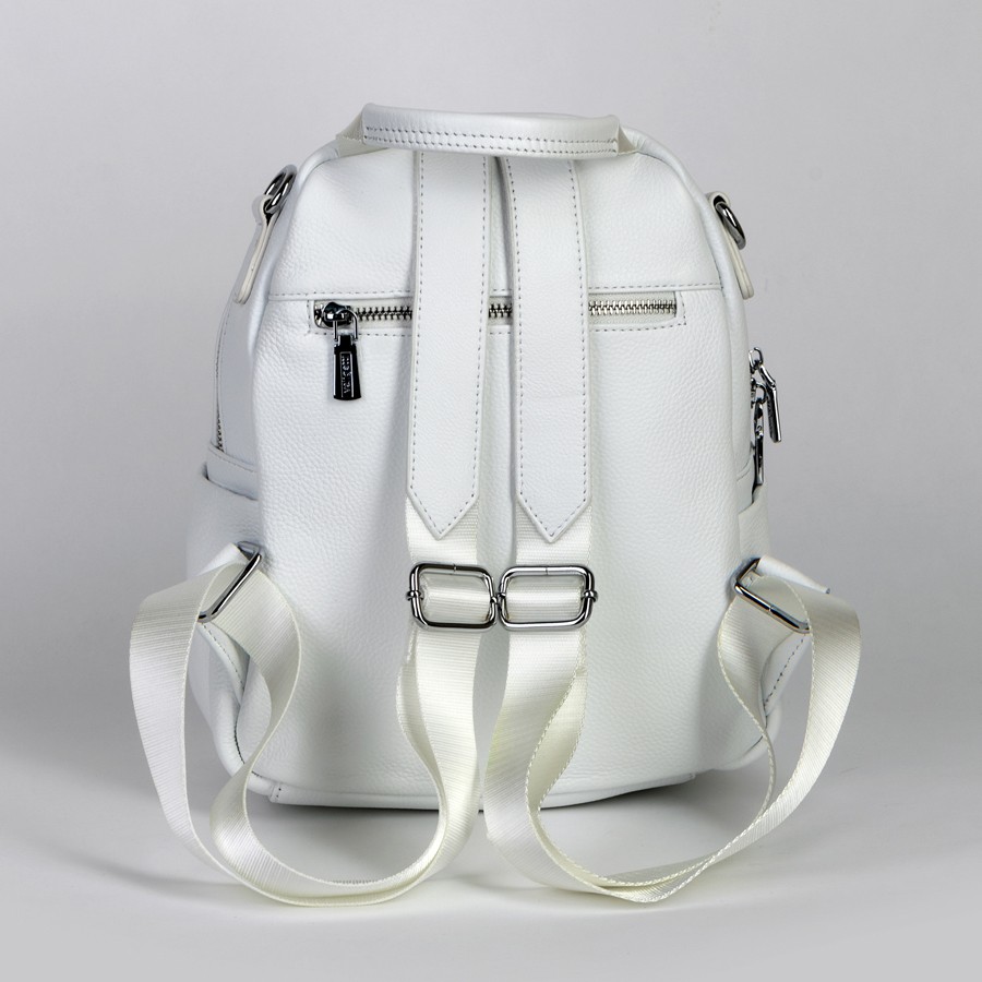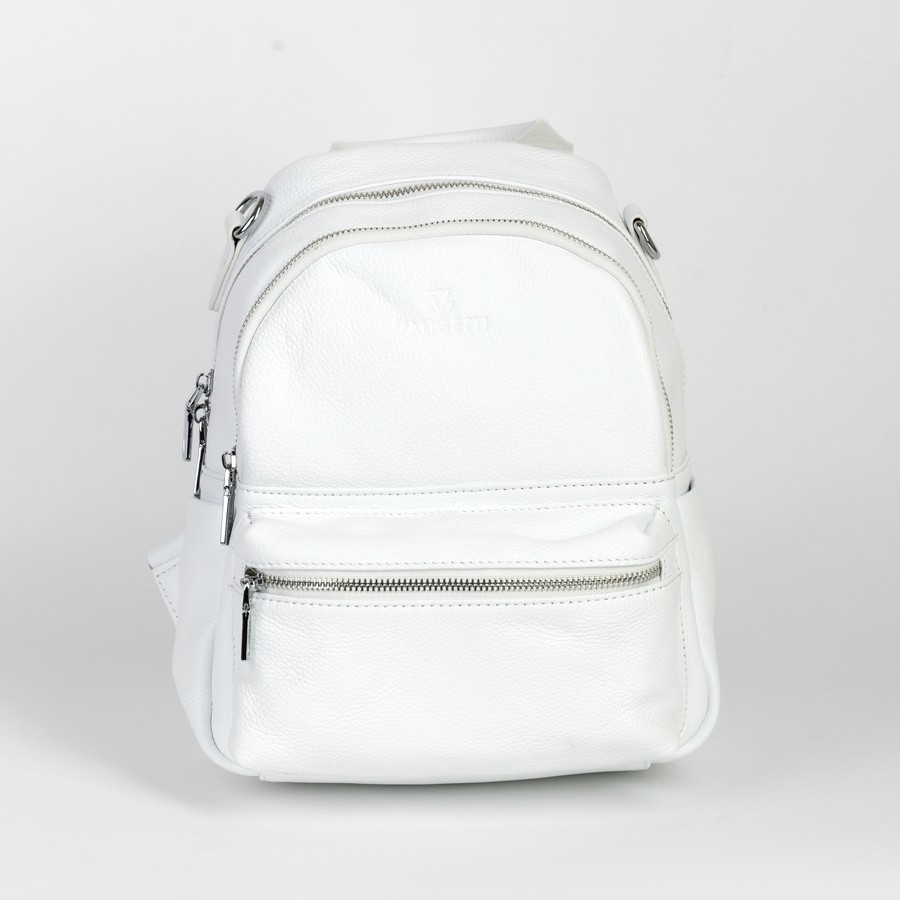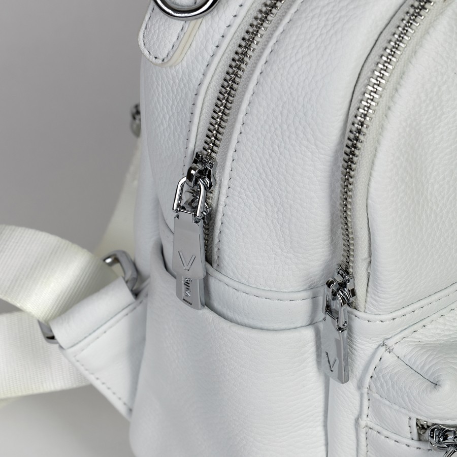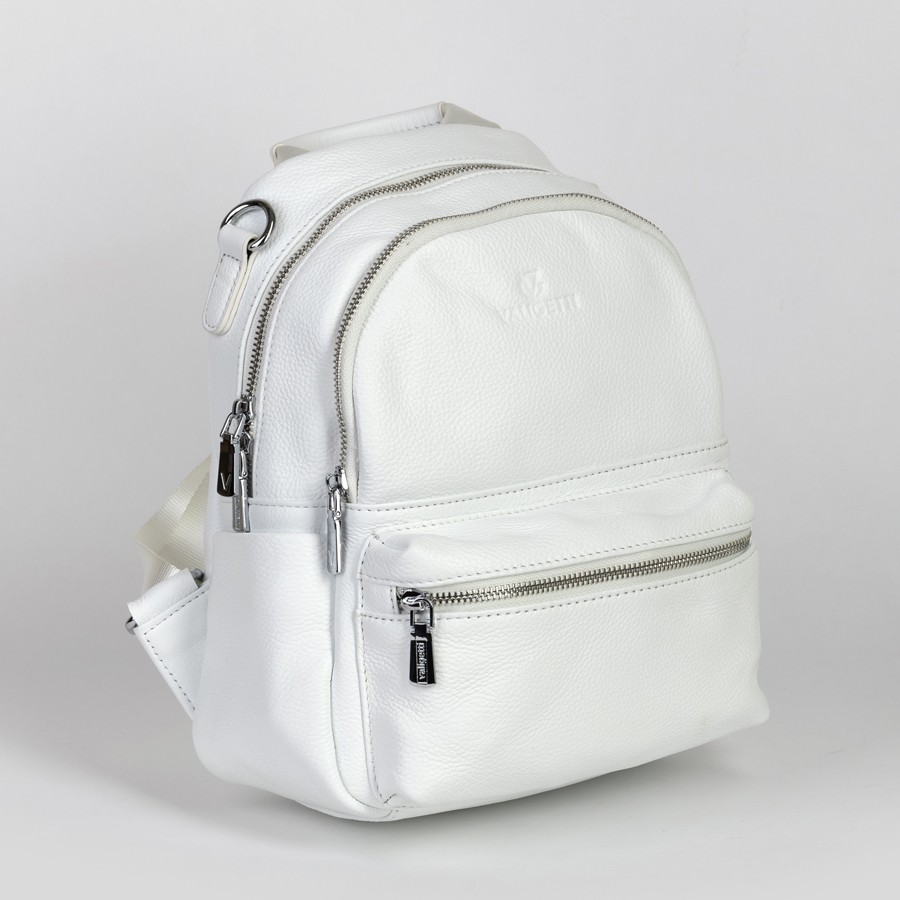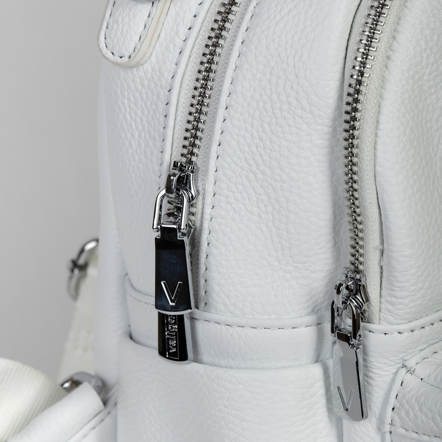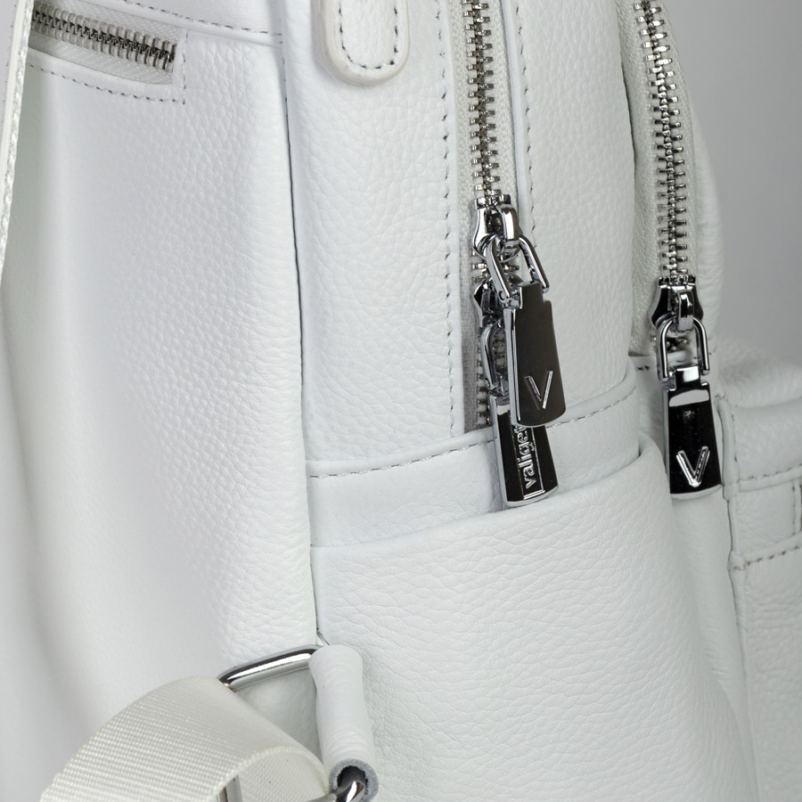 Элегантный женский рюкзак бренда Valigetti из натуральной кожи белого цвета с зернистой структурой. Прошит фирменной подкладочной тканью. Имеет плечевые лямки и пришитую кожаную ручку. Внутри основного отделения есть карман на молнии и 2 кармашка. На лицевой стороне есть дополнительной отделение и карман на молниях. По бокам 2 открытых кармашка. С задней стороны есть карман на молнии. В комплект входит съемный плечевой ремень