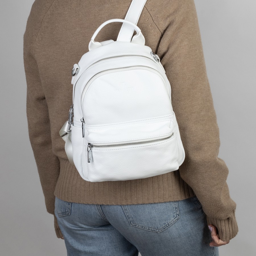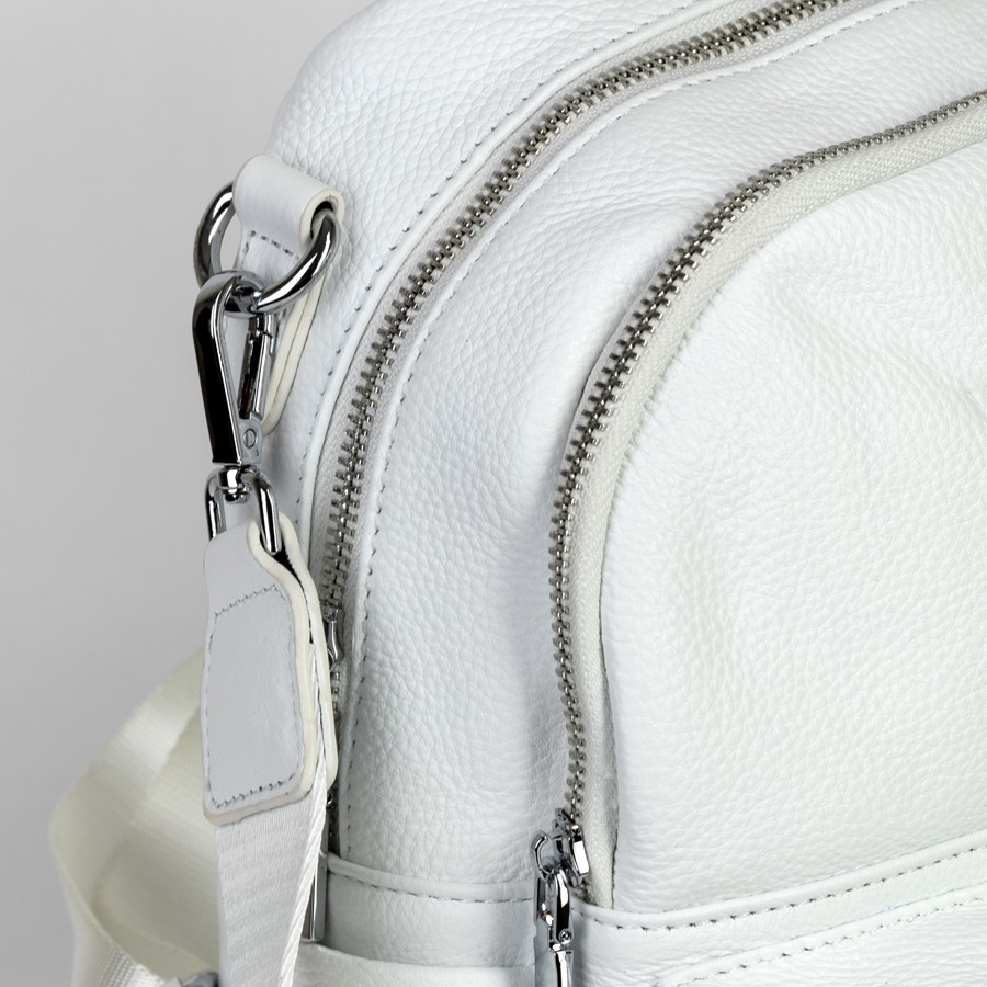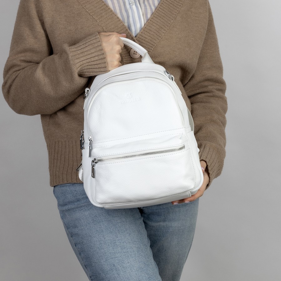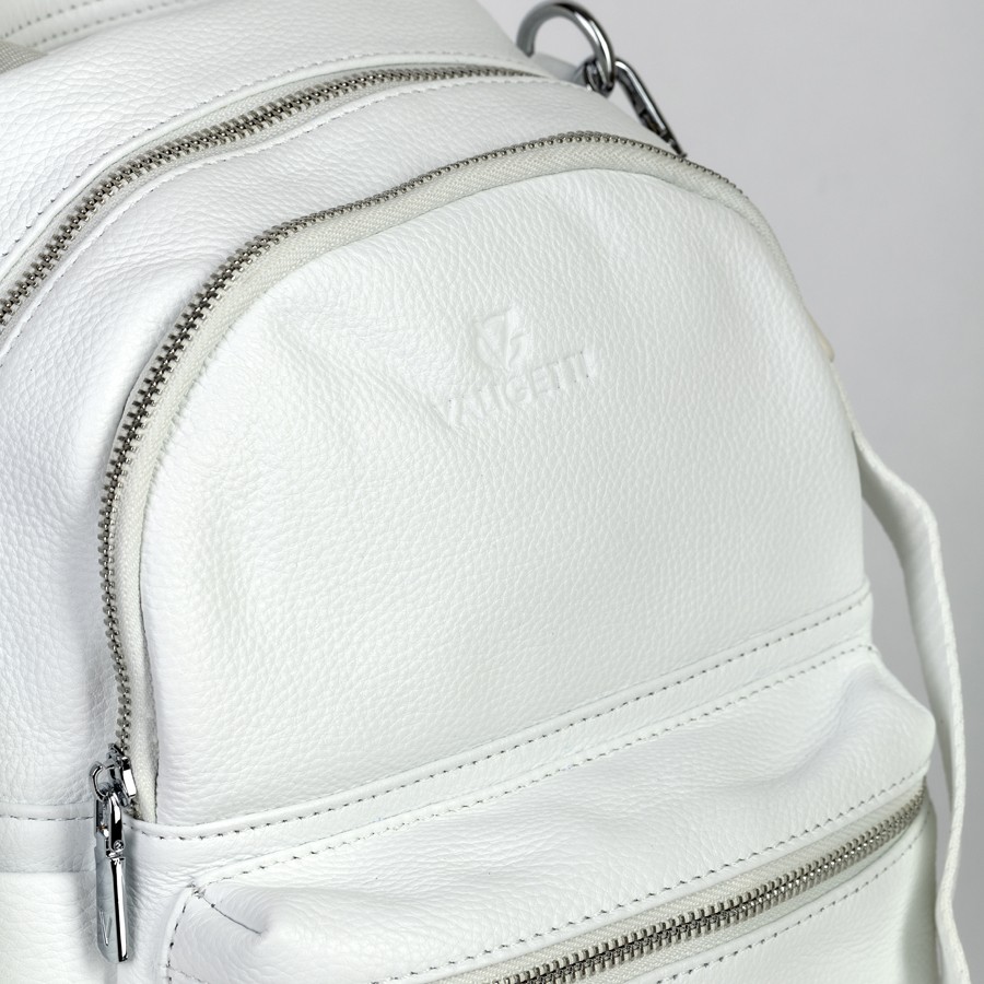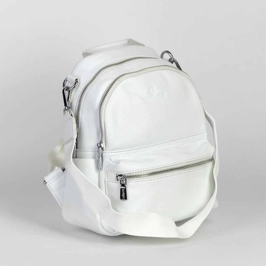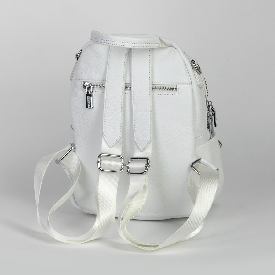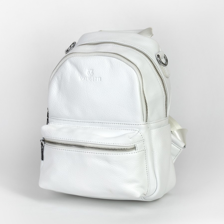 Элегантный женский рюкзак бренда Valigetti из натуральной кожи белого цвета с зернистой структурой. Прошит фирменной подкладочной тканью. Имеет плечевые лямки и пришитую кожаную ручку. Внутри основного отделения есть карман на молнии и 2 кармашка. На лицевой стороне есть дополнительной отделение и карман на молниях. По бокам 2 открытых кармашка. С задней стороны есть карман на молнии. В комплект входит съемный плечевой ремень