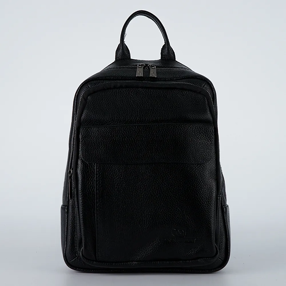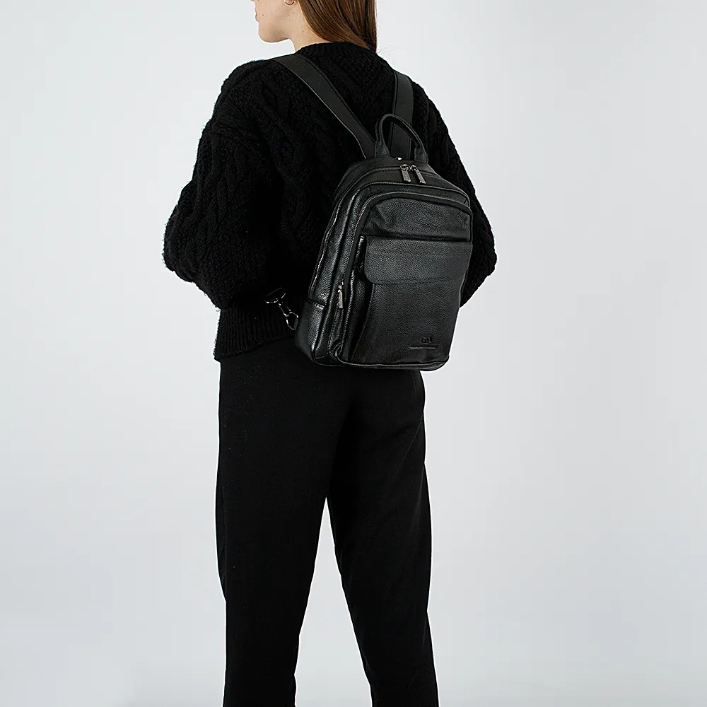 Рюкзак от торговой марки Francesco Molinary выполнен из натуральной кожи черного цвета. Модель с лямкой и регулируемыми плечевыми ля мками, соединенными молнией, что позволяет носить рюкзак на одном плече. Два отделения на молнии с фирменной подкладкой. В основном отделении – карман на молнии, два накладных кармана. На лицевой стороне – накладной карман с клапаном на скрытых магнитах. На задней стороне –карман на молнии.