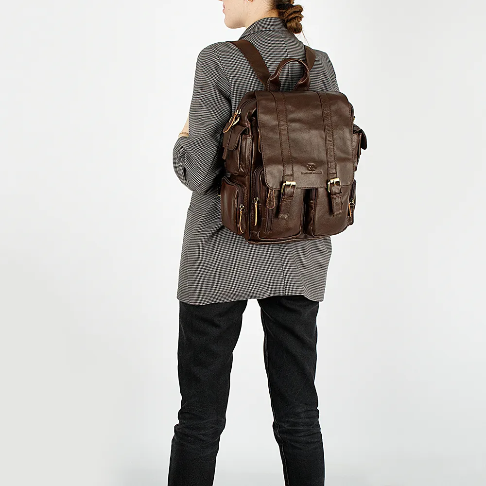 Большое количество карманов, а именно тринадцать, делает этот рюкзак универсальным и молодёжным. Рюкзак от бренда Francesco Molinary выполнен очень качественно, из натуральной кожи, что добавляет ему солидности. Спереди крышка на магнитах с декоративными ремнями, под ней накладные карманы и прорезной на молнии. По два боковых кармана слева и справа и основное отделение на молнии. Фурнитура металлическая золотистого цвета. Лямки рюкзака снизу на карабинчиках, что позволяет отстегнуть их и убрать в задний карман на молнии. После чего воспользоваться плотной кожаной ручкой для ношения в руке.