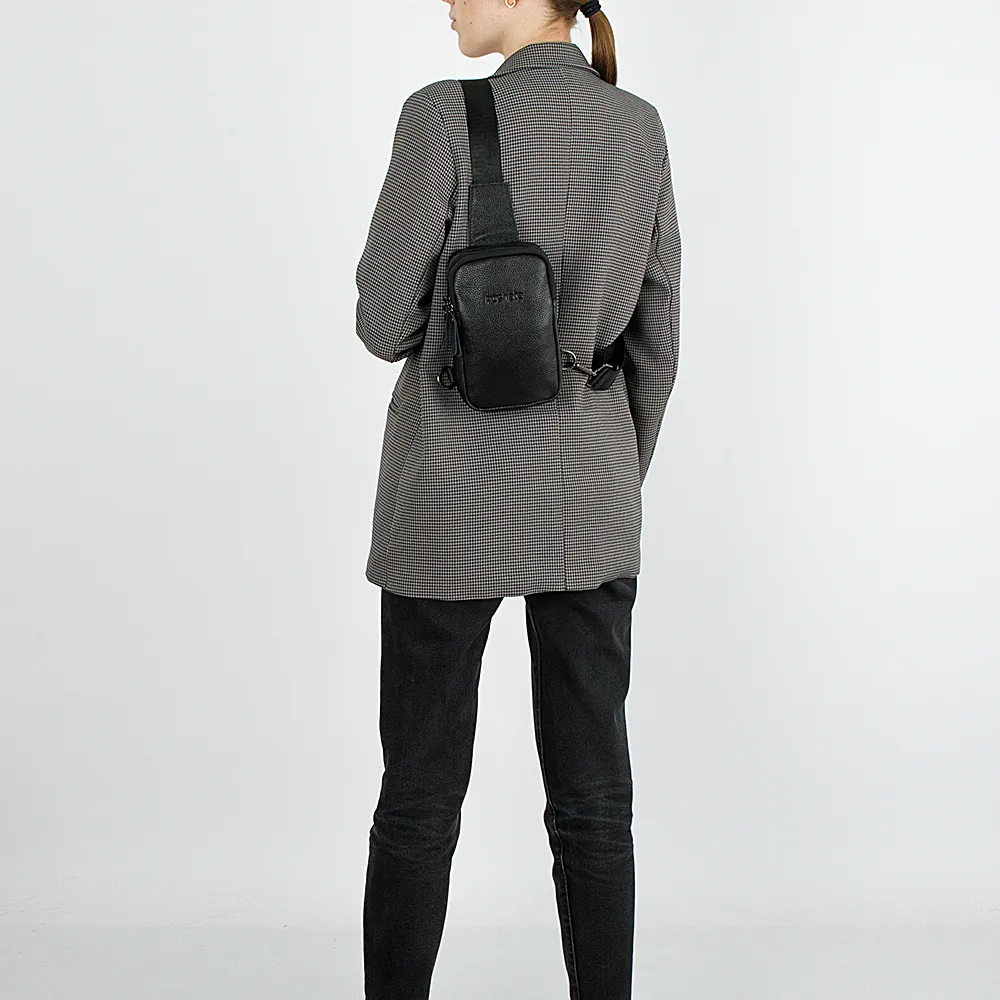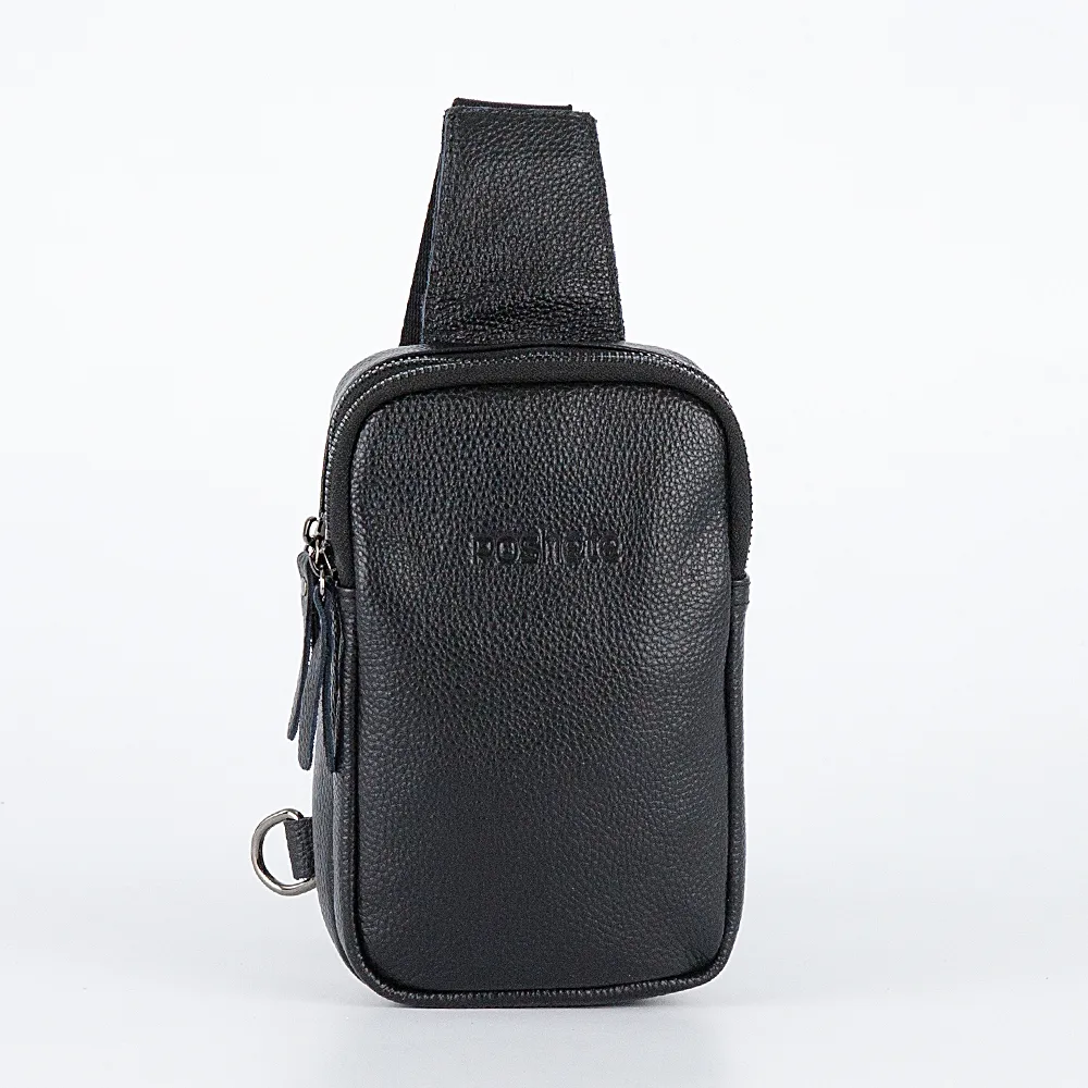 Компактный однолямочный рюкзак от торговой марки Poshete из натуральной кожи черного цвета. Модель с несъемной плечевой лямкой, кото рая снизу крепится карабином для ношения как на правом, так и на левом плече. Два отделения на молнии, с фирменной подкладкой. В заднем отделении – накладной карман.
