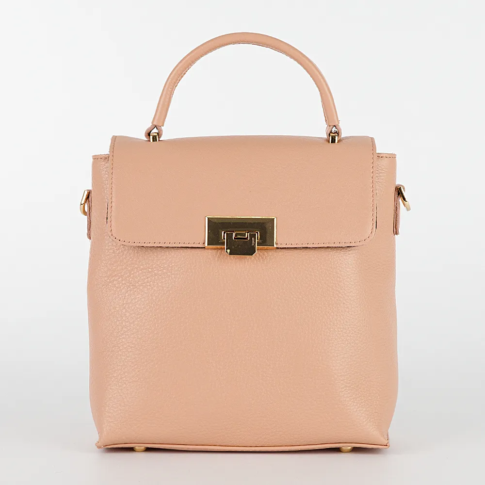 Стильная компактная сумка-рюкзак от бренда Poshete выполнена из натуральной кожи светло-розового цвета. Модель с удобной плотной ручкой, съемными плечевыми лямками, которые крепятся и используются как плечевой ремень. Фурнитура золотистого цвета. Рюкзак закрывается клапаном на поворотном замке. Отделение на молнии. Внутри: текстильная подкладка, карман на молнии, накладной карман. На задней стороне – вертикальный карман на молнии. Дно аксессуара оснащено металлическими ножками от износа.