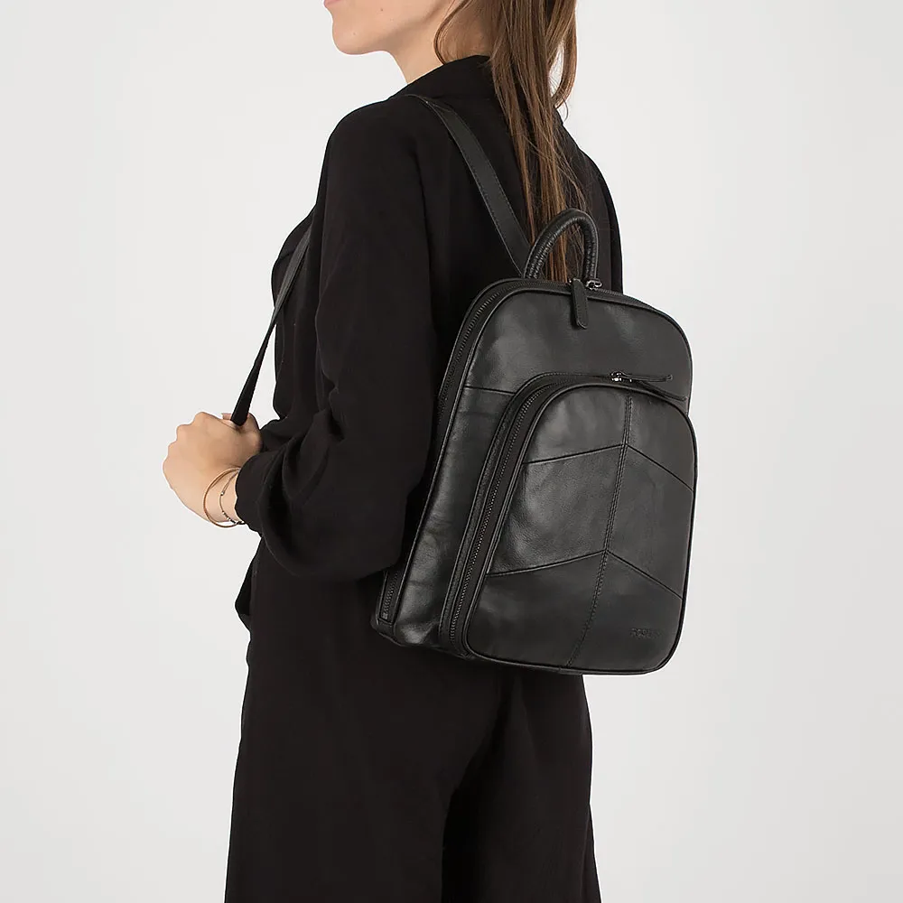 Стильный рюкзак от бренда Poshete выполнен из натуральной кожи насыщенного черного цвета. Модель в форме купола, с плотной ручкой и двумя плечевыми лямками с текстильной изнаночной стороной. Отделение на молнии по трем сторонам, что обеспечивает удобный доступ внутрь. Широко раскрывается гармошкой за счет вытачек. Внутри: средник и карман на молнии, накладной карман. На задней стороне – карман на молнии. На передней – накладной закругленный карман на молнии.