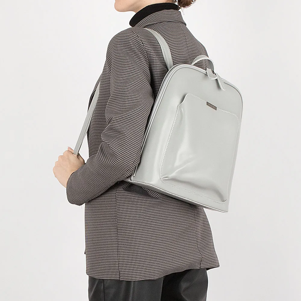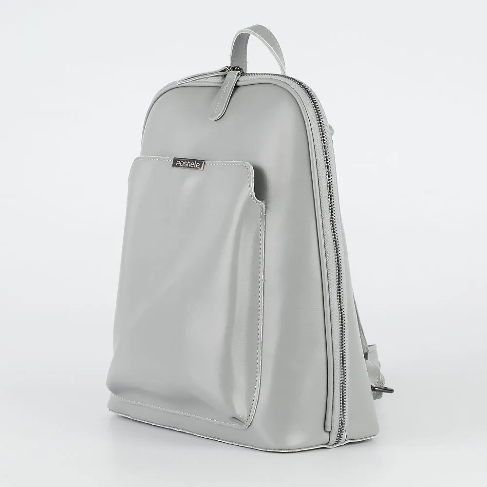 Сумка-рюкзак от торговой марки Poshete выполнена из натуральной кожи светло-серого цвета. Имеется лямка-переноска и регулируемые плечевые лямки, которые при стягивании превращаются в плечевой ремень с наплечником. Отделение на молнии по трем сторонам, что обеспечивает комфортный доступ. Внутри: фирменная подкладка, карман на молнии, два накладных кармана. На задней стороне – прорезной карман на молнии. На передней стороне – накладной карман.