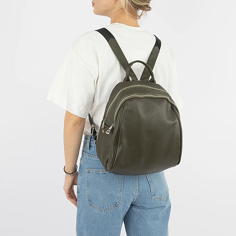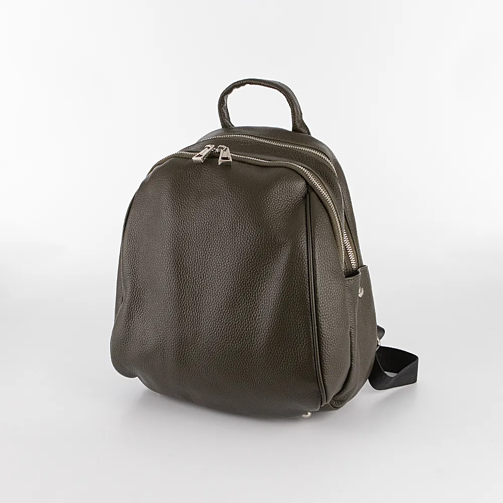 Рюкзак от торговой марки Poshete из натуральной кожи цвета хаки. Модель с лямкой-переноской и регулируемыми плечевыми лямками. Два отделения на молнии, с текстильной подкладкой. Переднее отделение на молнии с двумя встречными бегунками; внутри: два накладных кармана. В основном отделении: карман на молнии, перегородка с карманом на молнии, образующая накладной карман. По бокам – накладной карман на кнопке. На задней стороне – вертикальный карман на молнии. Дно оснащено металлическими ножами для защиты от износа.