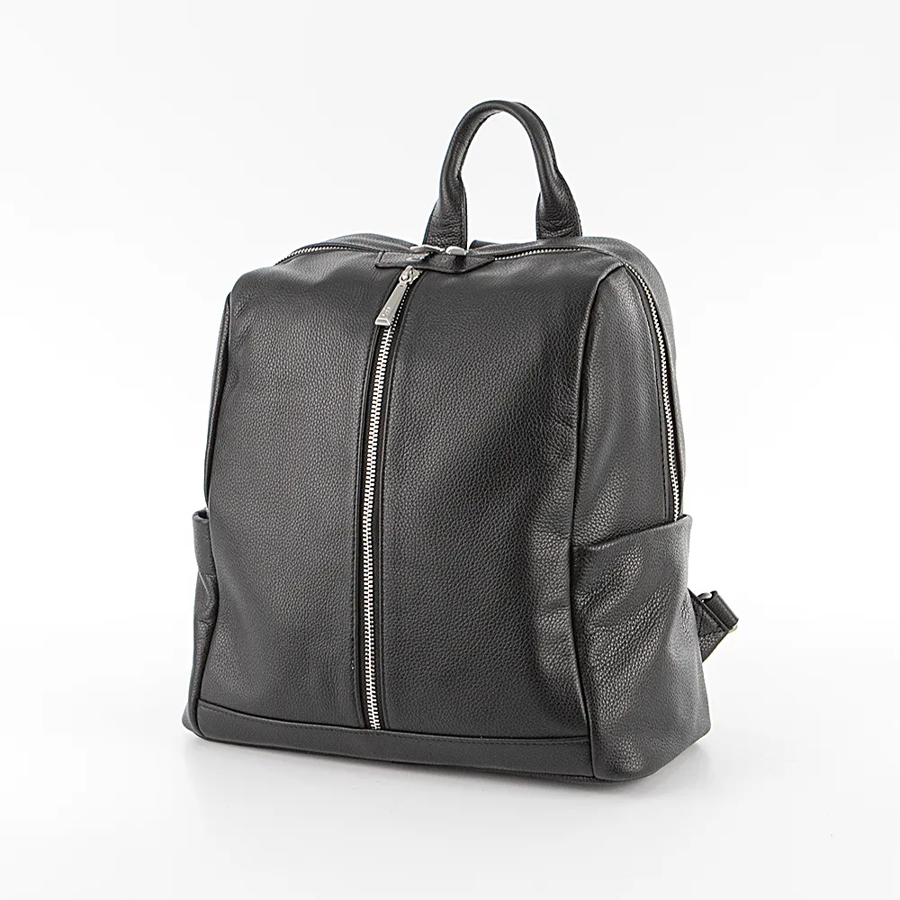 Рюкзак от торговой марки Francesco Molinary из натуральной кожи черного цвета. Модель с лямкой-переноской и регулируемыми плечевыми лямками. Отделение на молнии с двумя бегунками широко раскрывается, обеспечивая удобный доступ. Внутри: фирменная подкладка, два накладных кармана, карман на молнии. На лицевой и задней сторонах – карман на молнии. По бокам – накладной карман без застежки. На дне имеются нашивки для защиты от износа.