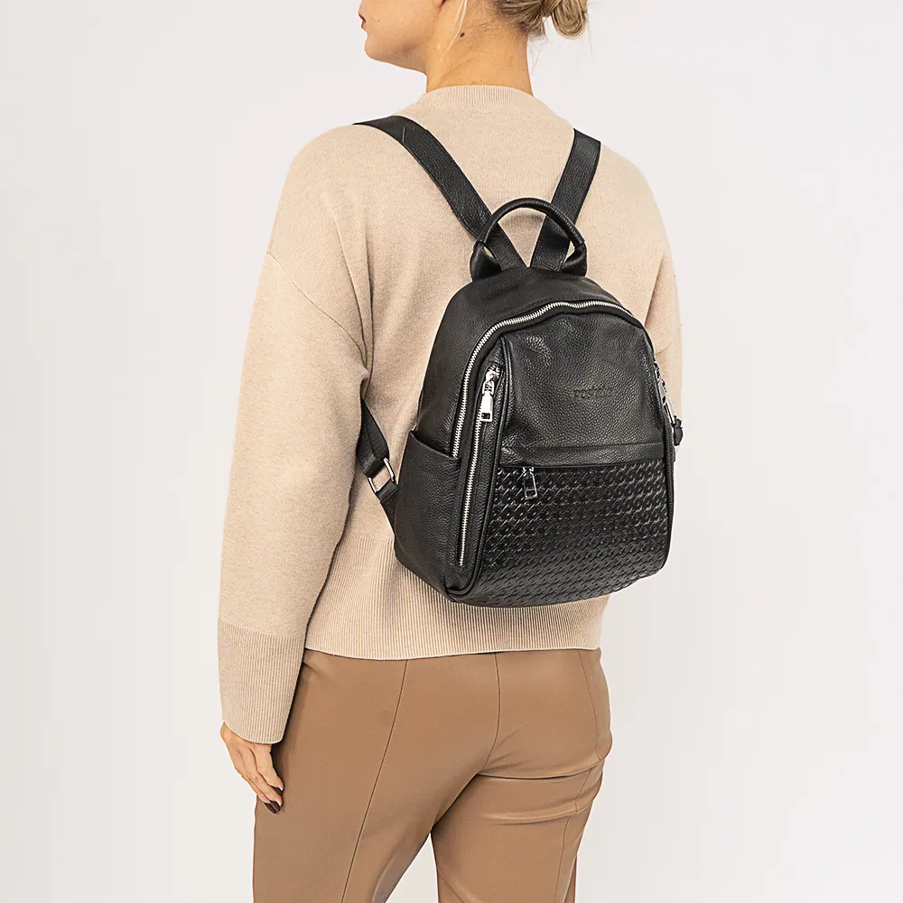 Рюкзак от торговой марки Poshete из натуральной кожи черного цвета. Модель с лямкой-переноской, регулируемыми плечевыми лямками. Отделение на молнии. Внутри: фирменная подкладка, карман на молнии, накладной карман, перегородка. На лицевой стороне, декорированной оригинальным тиснением, имеется три кармана на молнии. На спинке – карман на молнии.