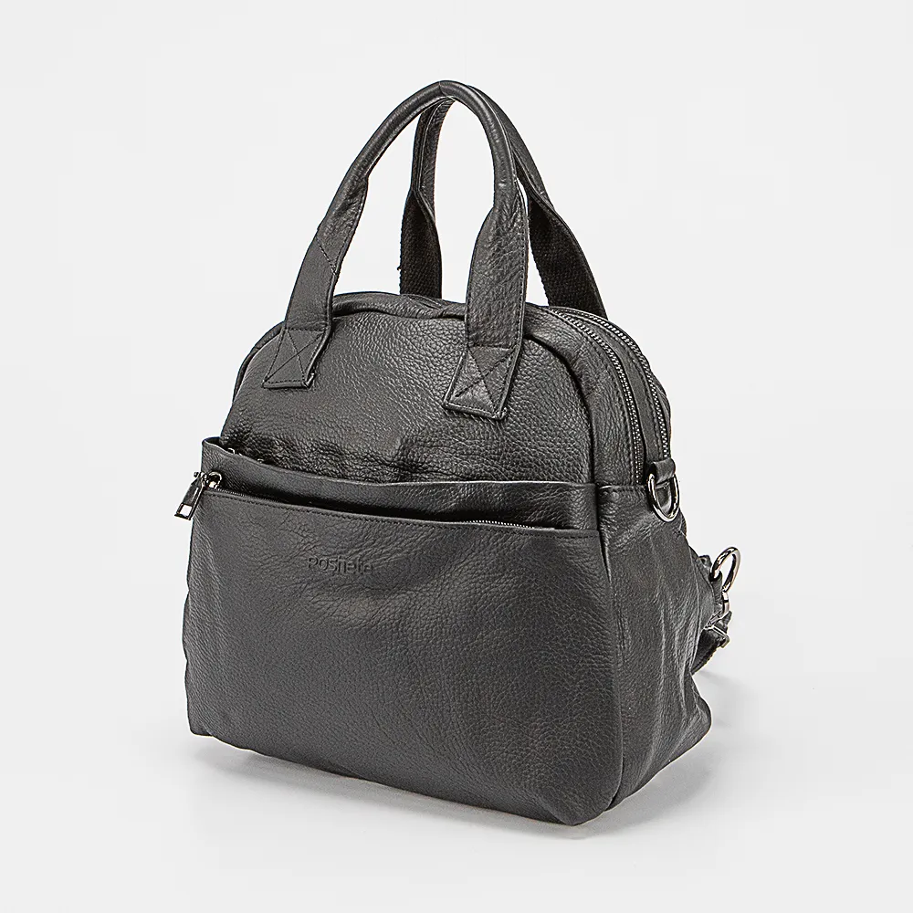 Сумка-рюкзак от торговой марки Poshete из натуральной кожи черного цвета. Модель с двумя ручками, съемными регулируемыми плечевыми лямками, которые можно использовать как плечевой ремень. Два отделения на молнии, с текстильной подкладкой. В одном из них – карман на молнии, в другом – два накладных кармана. На лицевой стороне – два кармана на молнии. Сзади – карман на молнии.