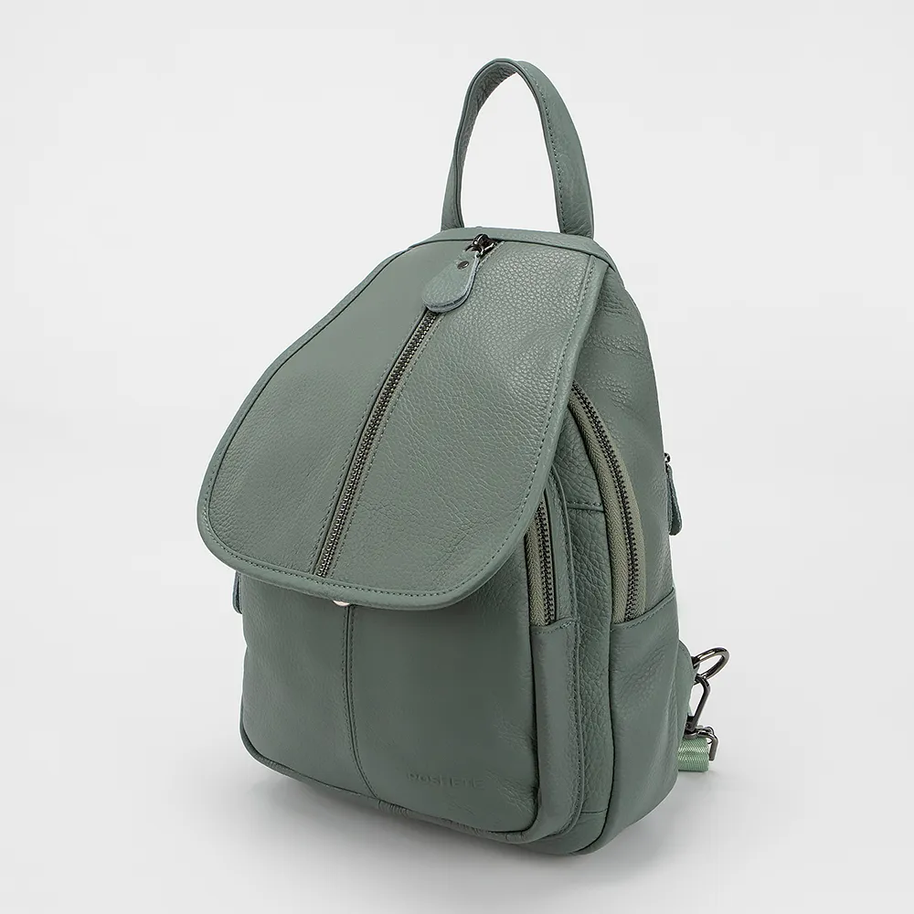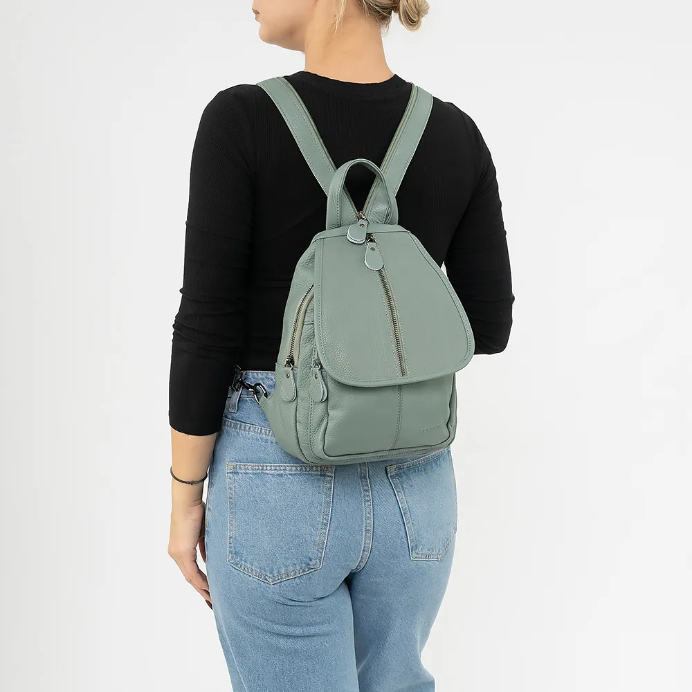 Рюкзак от торговой марки Poshete из натуральной кожи голубого цвета. Компактная модель с лямкой-переноской и регулируемыми плечевыми лямками, соединяемыми молнией в одну для ношения на одной лямке. Закрывается клапаном на магнитной кнопке, на клапане - вертикальный карман на молнии. Два отделения на молнии, с фирменной подкладкой. В основном - карман на молнии, два накладных кармана. На задней стороне - карман на молнии.