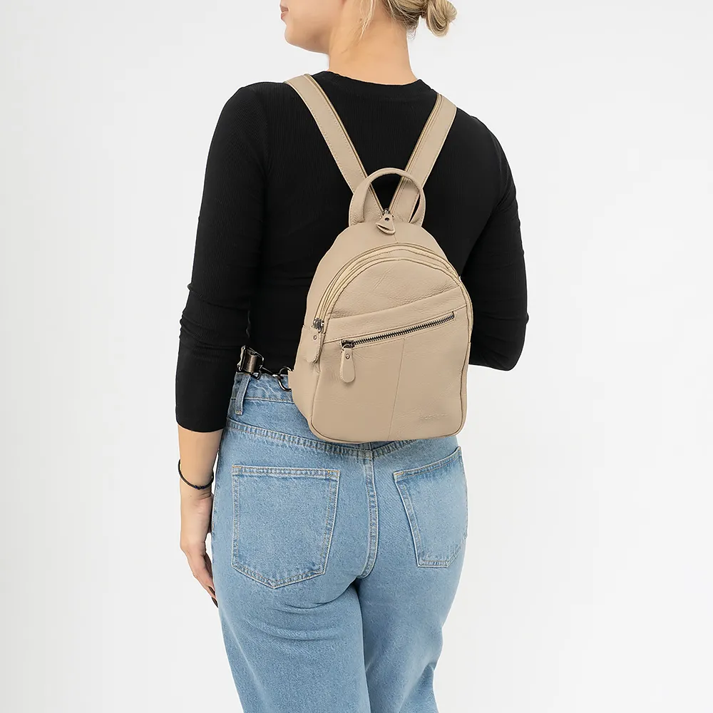 Рюкзак от торговой марки Poshete из натуральной кожи бежевого цвета. Компактная модель с лямкой-переноской и регулируемыми плечевыми лямками с разделяющей молнией и на карабине, благодаря чему рюкзак можно носить как однолямочный на одной широкой лямке как на левом, так и на правом плече. Два отделения на молнии. В основном отделении – текстильная подкладка, карман на молнии, накладной карман. На лицевой и задней сторонах - карман на молнии.