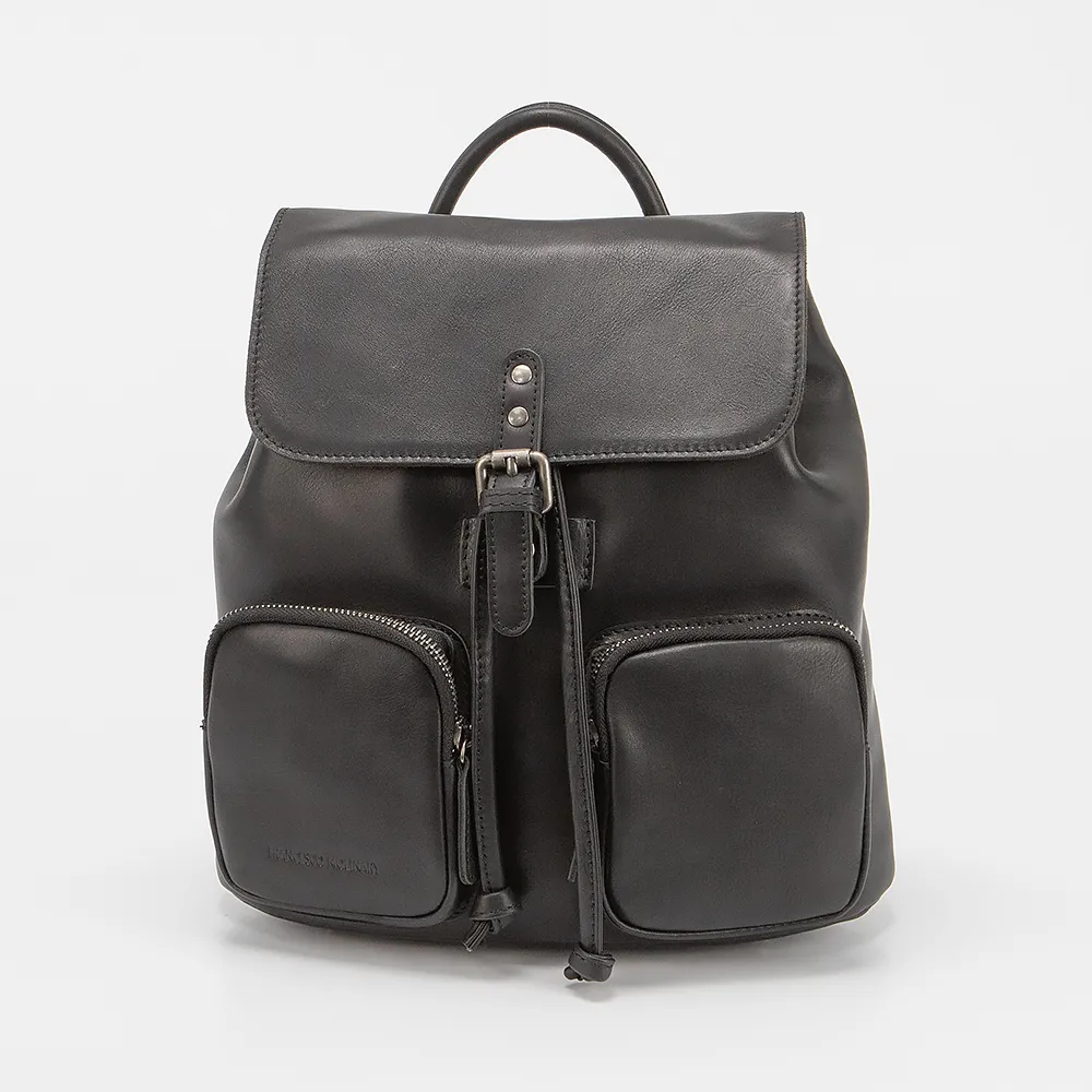 Рюкзак от торговой марки Francesco Molinary выполнен из натуральной кожи черного цвета. Модель с ручкой для переноски и двумя регулируемыми плечевыми ремнями. Клапан на магнитной кнопке закрывает отделение с текстильной подкладкой, карманом на молнии, накладным карманом. Стягивается шнуром по принципу торбы. На лицевой стороне - два объемных кармана на молнии. На задней стороне - вертикальный карман на молнии.