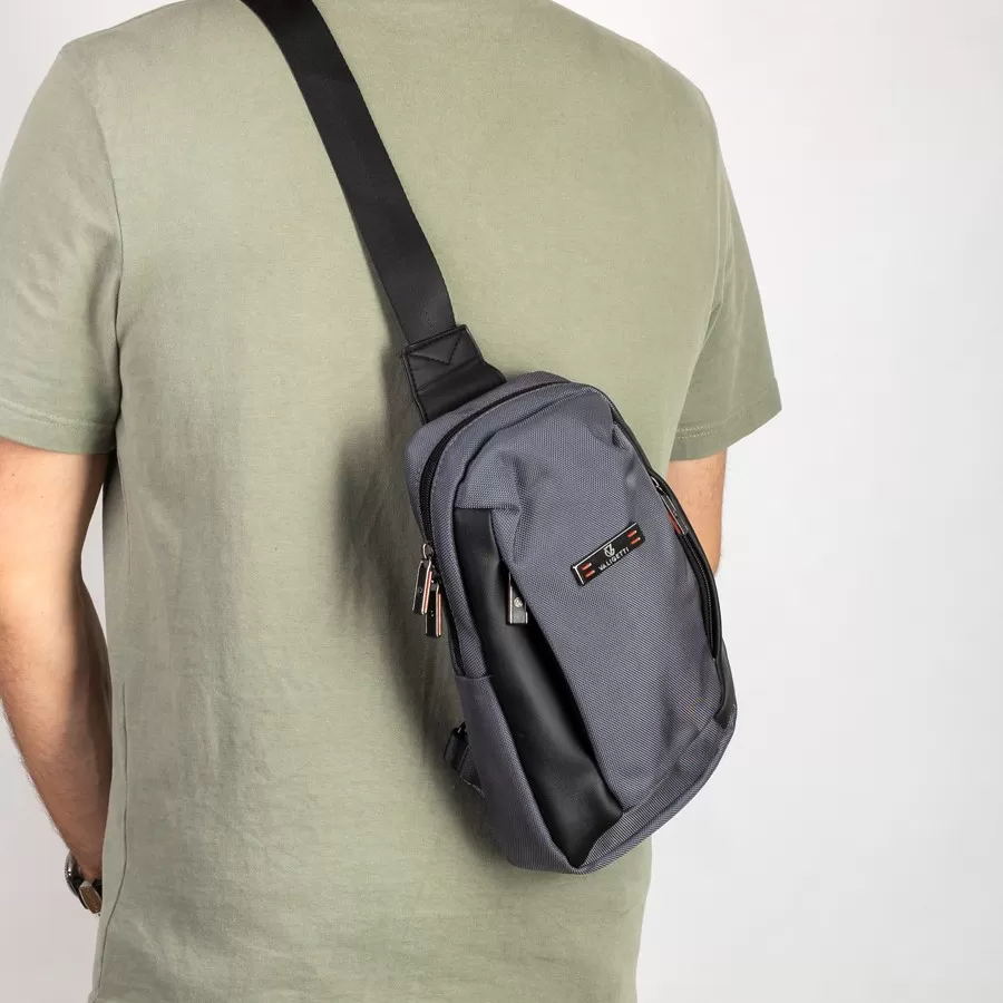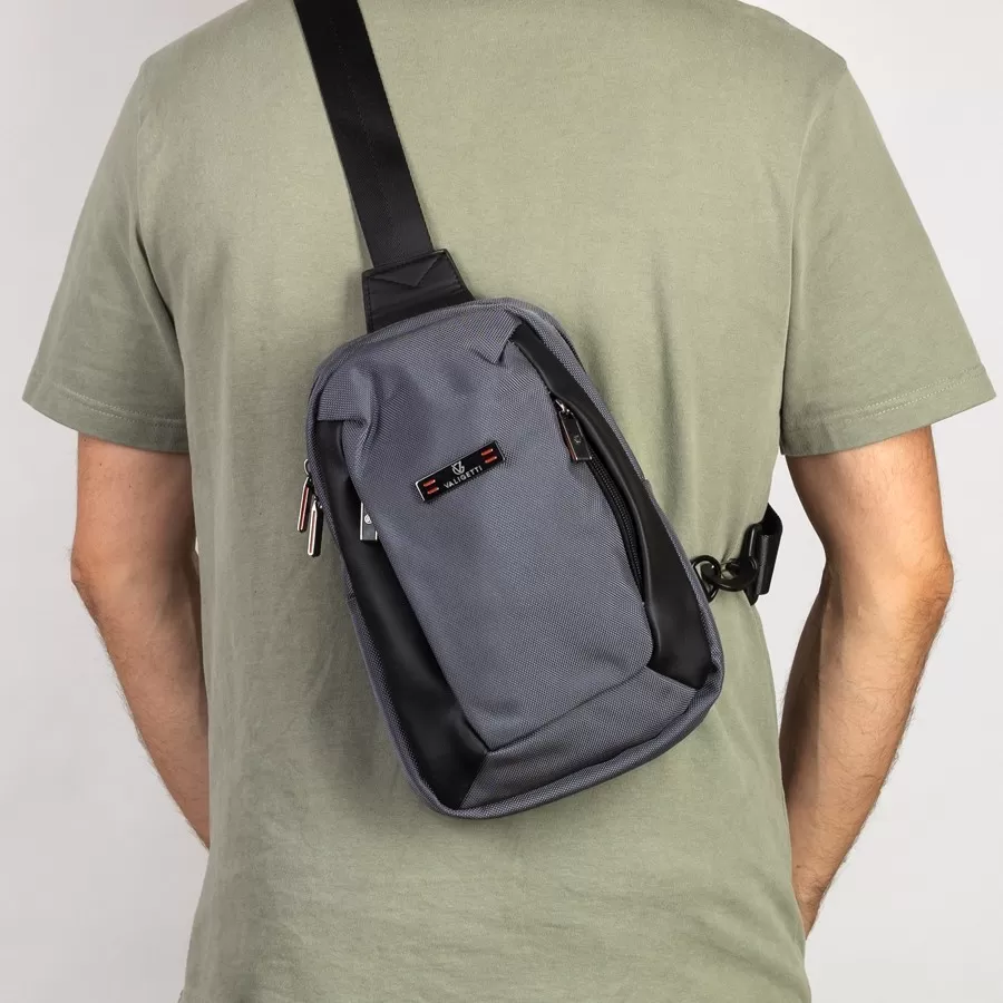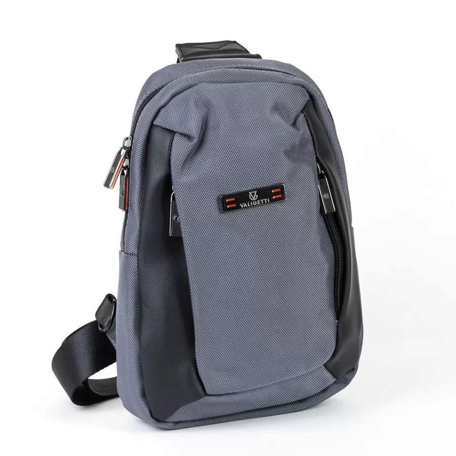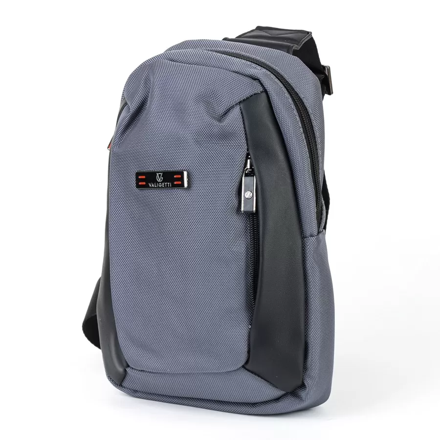 Мужской однолямочный рюкзак бренда Valigetti из текстиля. Имеет вшитую с одной стороны и перестегиваемую на карабин с другой плечевую текстильную лямку. Внутри основного отделения под молнией с двойным замочком есть карман на молнии. На лицевой стороне есть 2 кармана на молнии