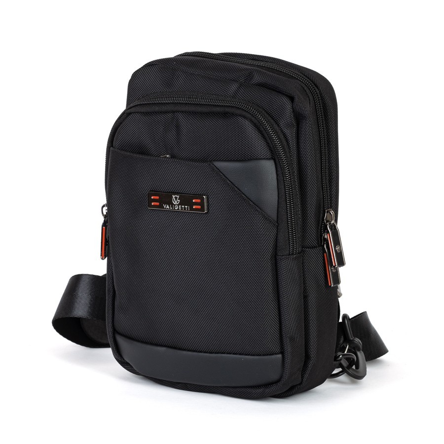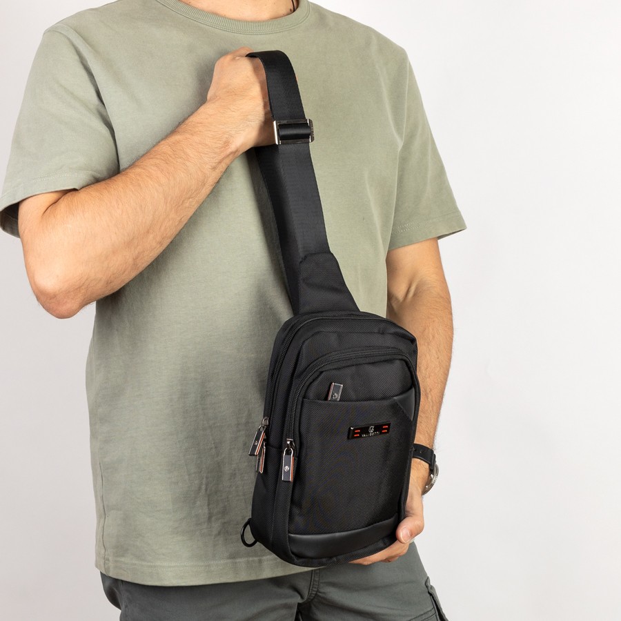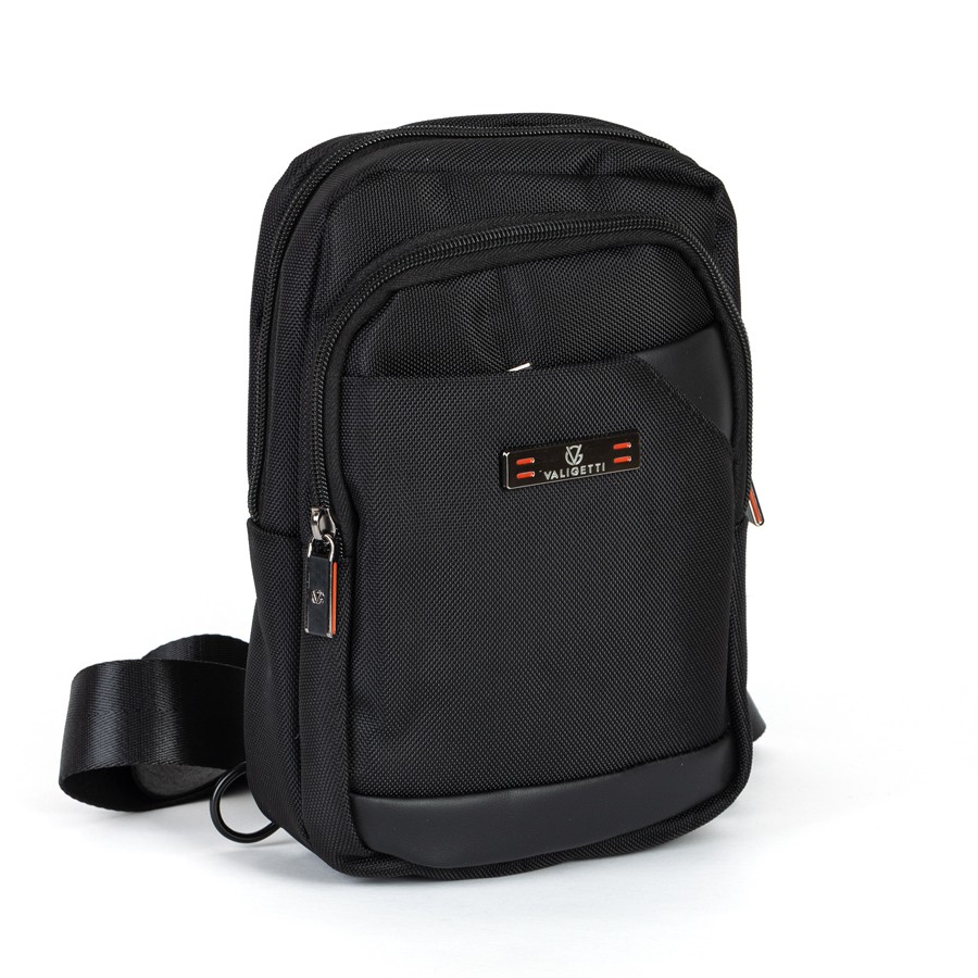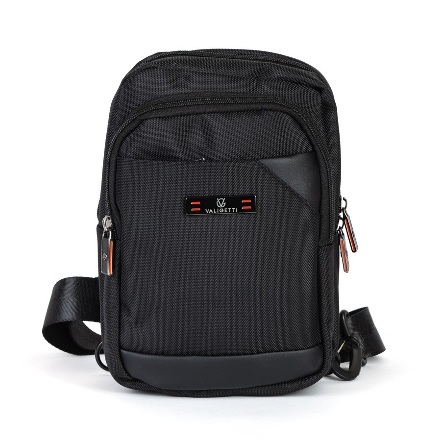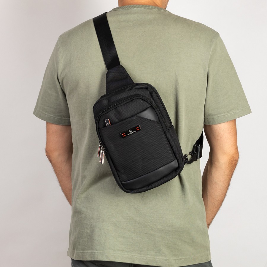 Мужской однолямочный рюкзак бренда Valigetti из текстиля. Имеет вшитую регулируемую плечевую текстильную лямку. Внутри основного отделения под молнией есть карман на молнии. На лицевой стороне есть 2 кармана на молнии