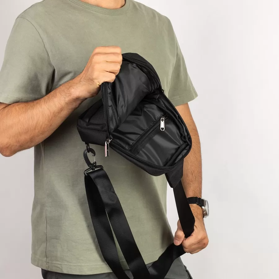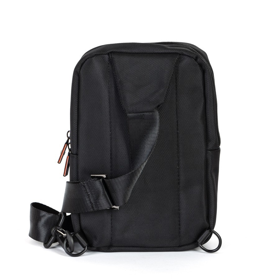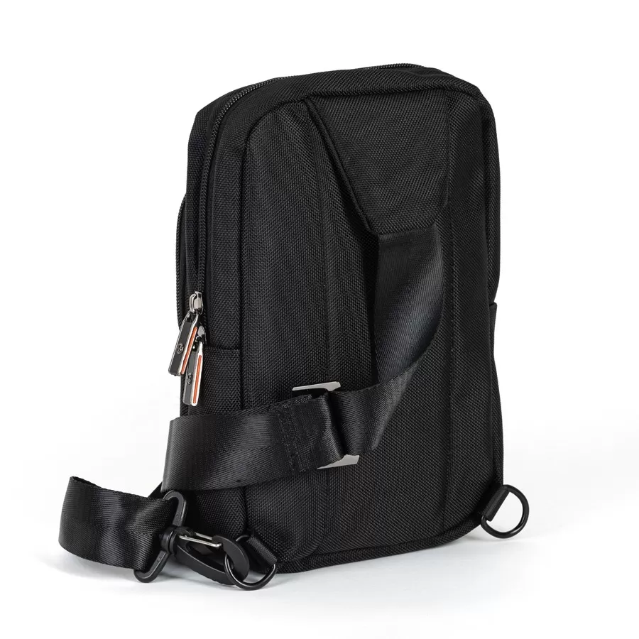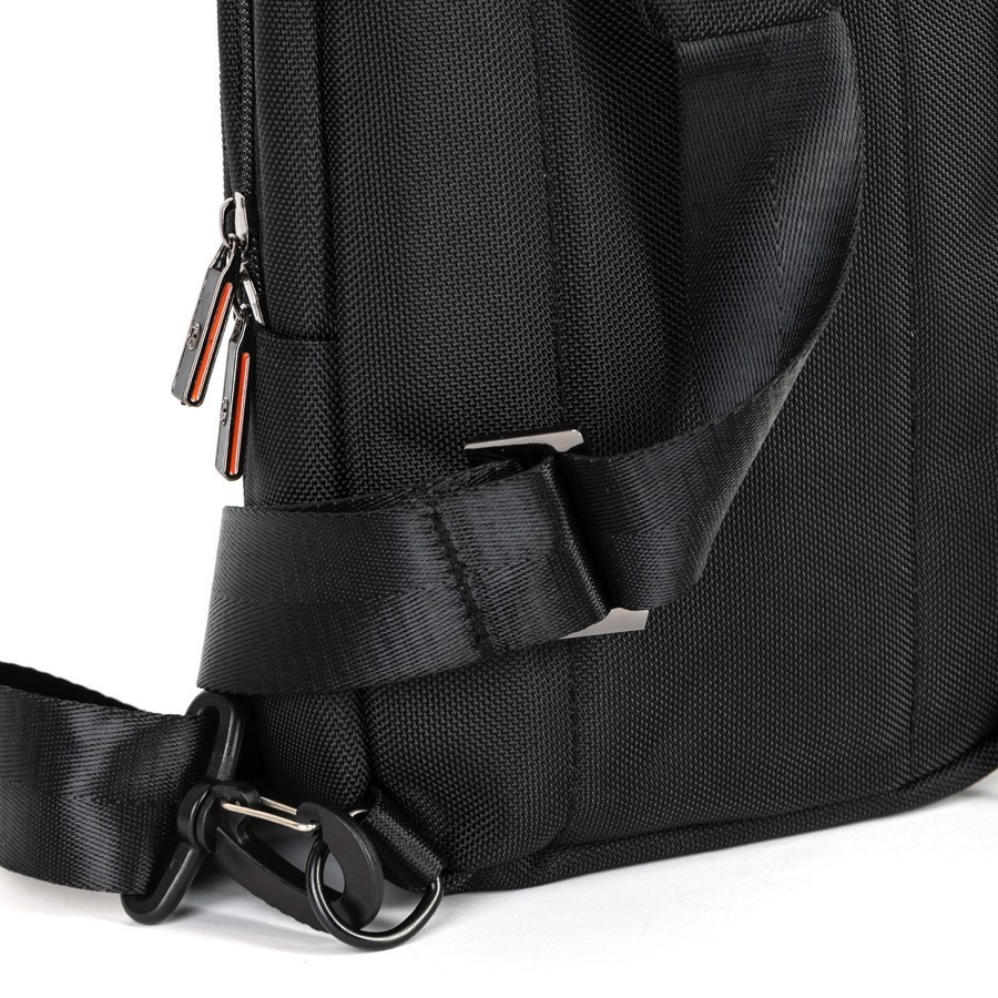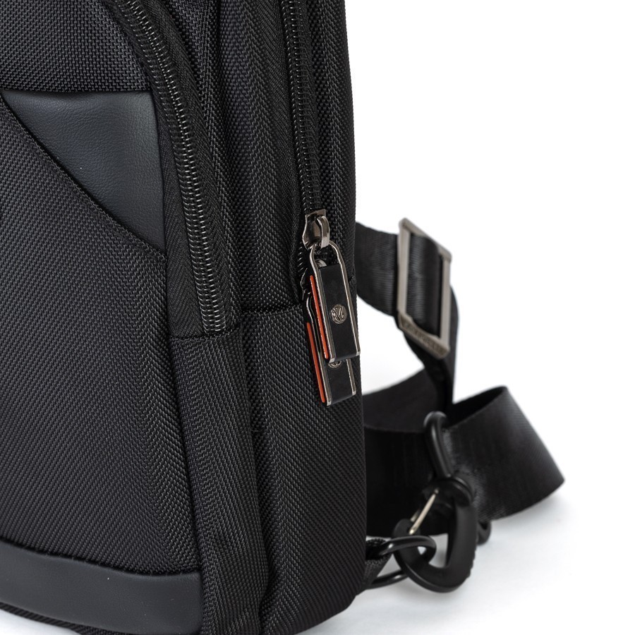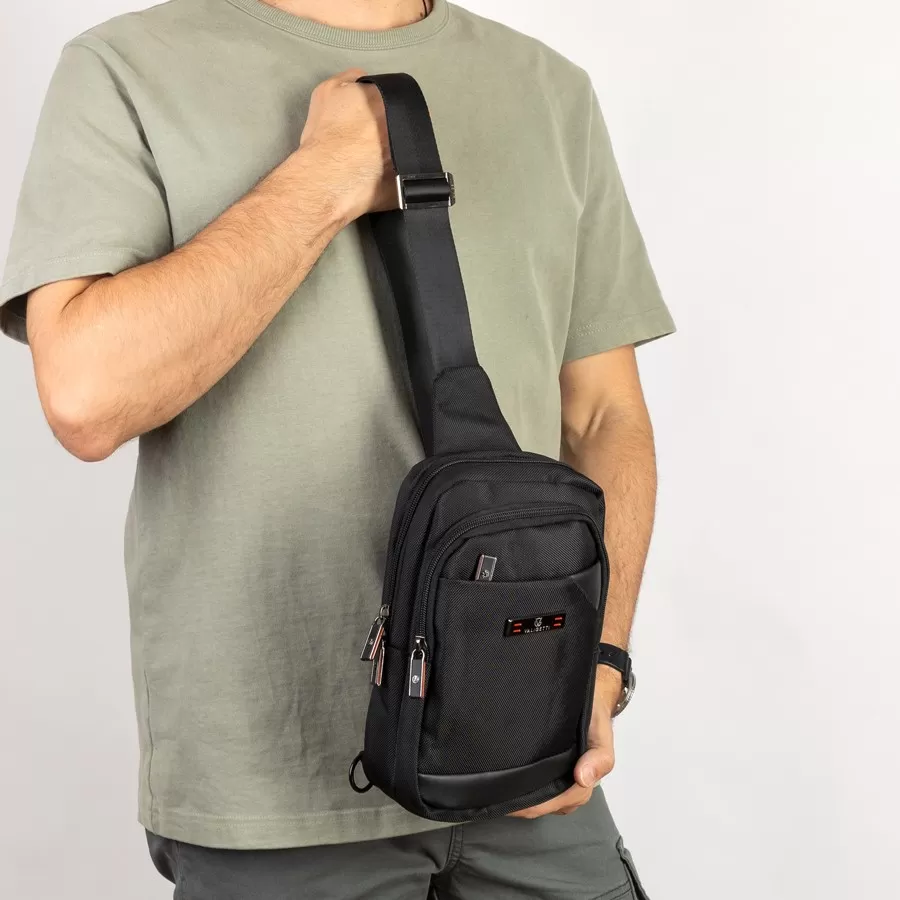 Мужской однолямочный рюкзак бренда Valigetti из текстиля. Имеет вшитую регулируемую плечевую текстильную лямку. Внутри основного отделения под молнией есть карман на молнии. На лицевой стороне есть 2 кармана на молнии