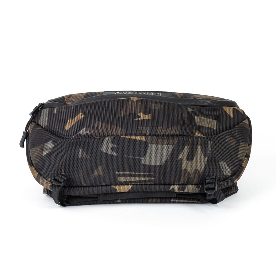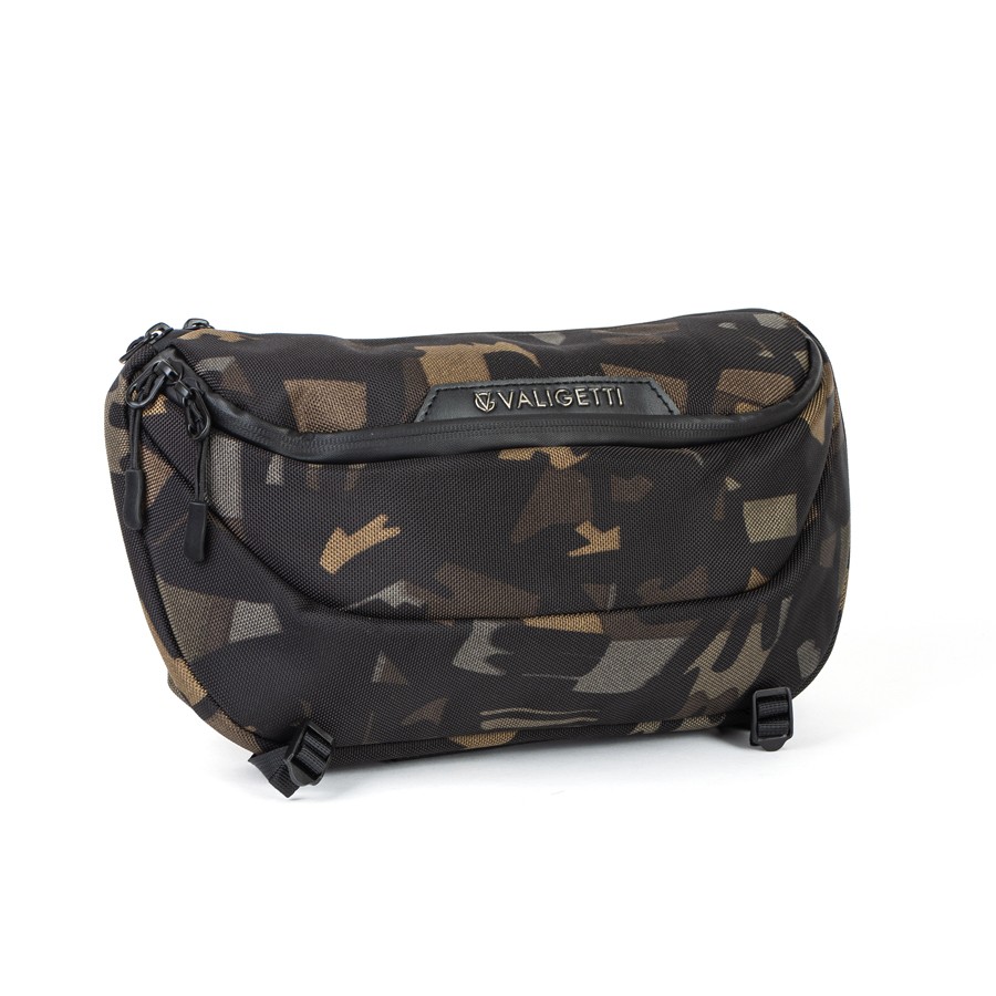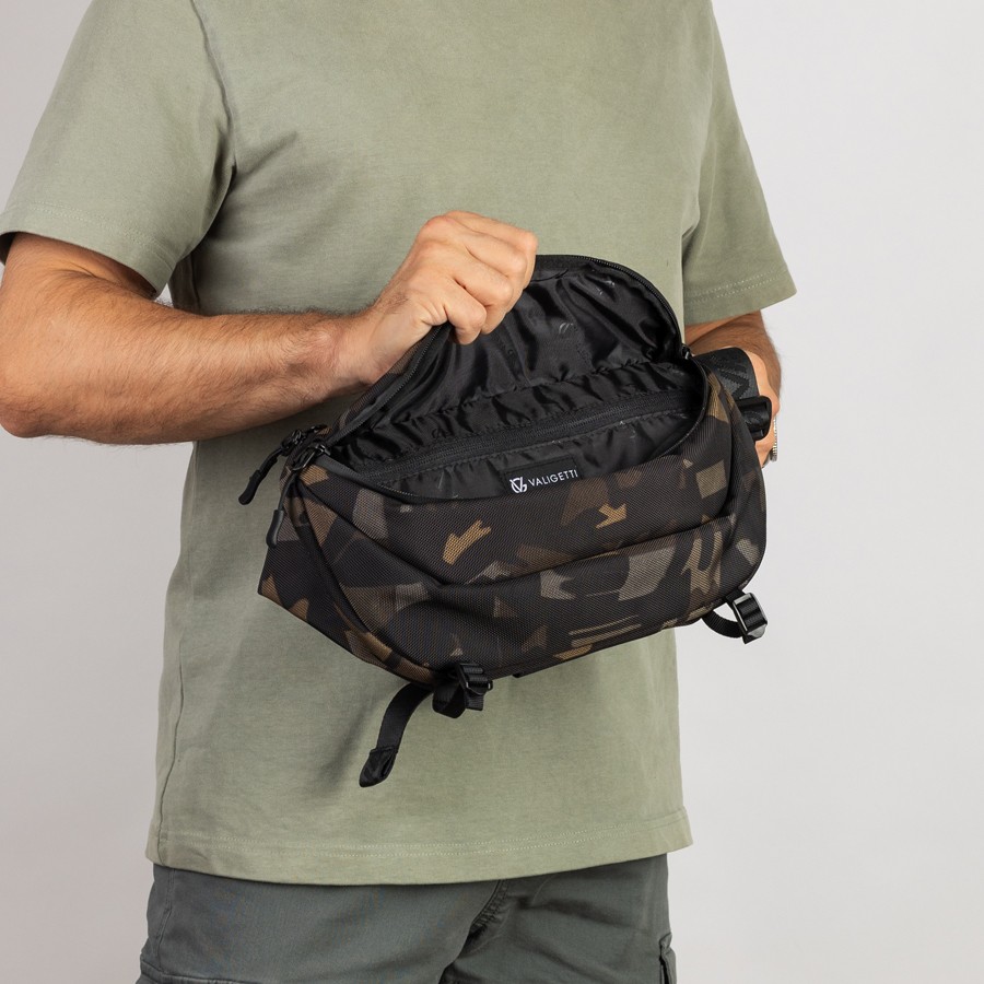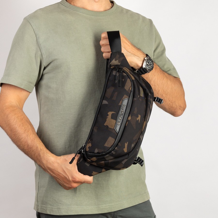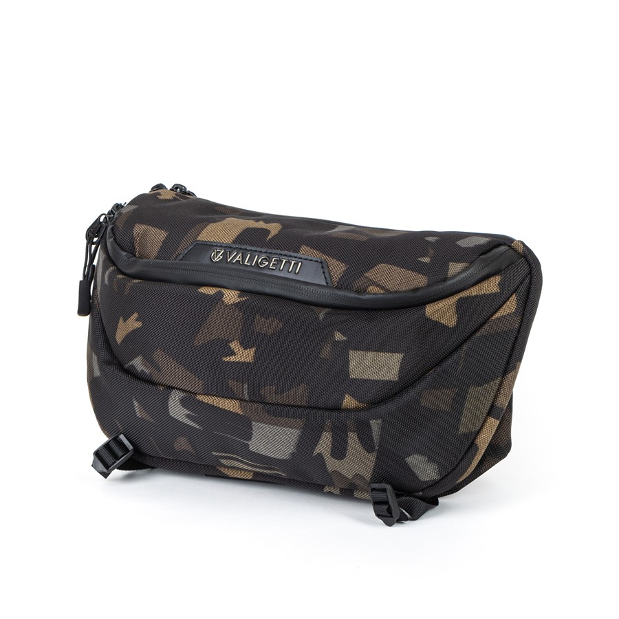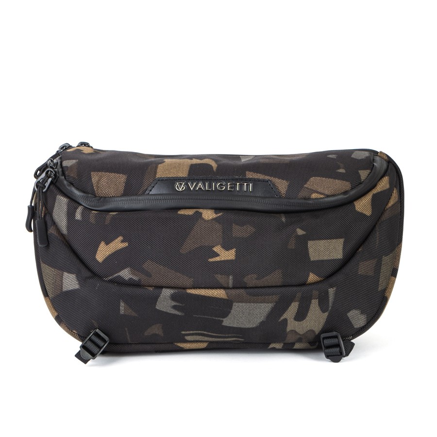 Мужская поясная сумка бренда Valigetti из текстиля в милитари стиле. Имеет вшитую регулируемую текстильную лямку. Прошита фирменной подкладочной тканью. Внутри основного отделения с подрезиненной молнией с двумя замочками есть разделение на 2 отсека и 4 сетчатых кармашка для мелких вещей. На лицевой стороне есть дополнительное отделение на подрезиненной молнии с двумя замочками с внутренним карманом на молнии. Сзади имеется карман на молнии. Снизу есть регуляторы объема сумки