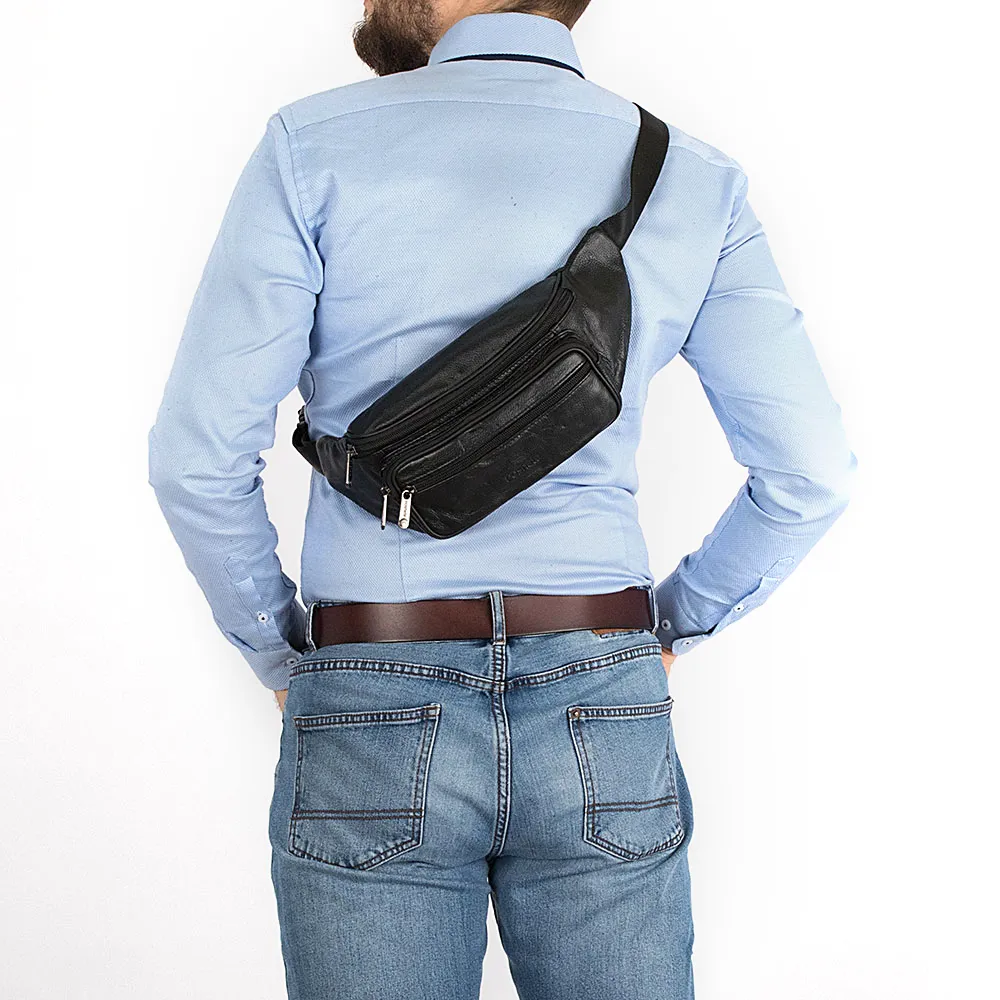 Мужская сумка на пояс от бренда Poshete выполнена из натуральной кожи чёрного цвета. Основное отделение на молнии с текстильной подкладкой, снаружи два кармана на молнии. Модель имеет регулируемый поясной ремень на застежке фастекс.