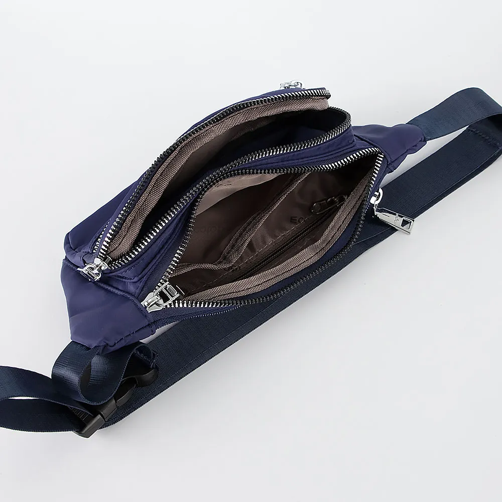 Женская сумка на пояс от Ecotope выполнена из текстильного материала зеленого цвета с текстильной подкладкой внутри. Основное отделение на молнии, спереди два кармана на молнии. Модель с текстильным регулируемым поясным ремнем на застежке фастекс.