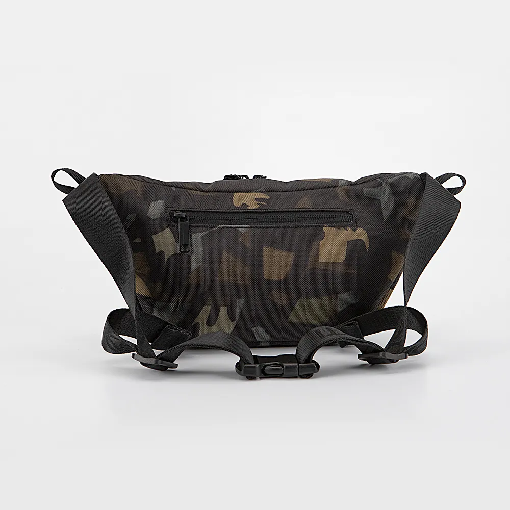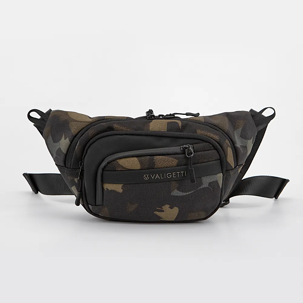 Сумка на пояс от торговой марки Valigetti из прочной текстильной ткани с принтом «камуфляж». Модель с регулируемым поясным ремнем. Отделение на молнии. Внутри: фирменная подкладка, карман на молнии, накладной карман. На лицевой стороне – два кармана на молнии. На задней стороне – карман на молнии.