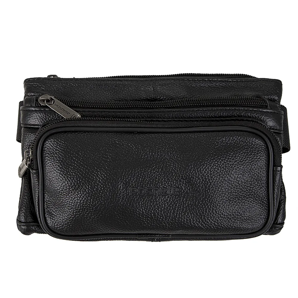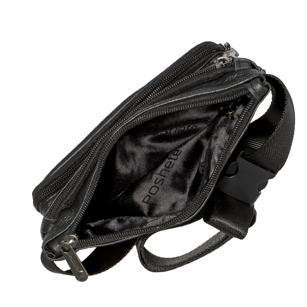 Мужская сумка на пояс от бренда Poshete выполнена из натуральной кожи чёрного цвета. Основное отделение на молнии с текстильной подкладкой, снаружи два кармана на молнии. Модель имеет регулируемый поясной ремень на застежке фастекс.