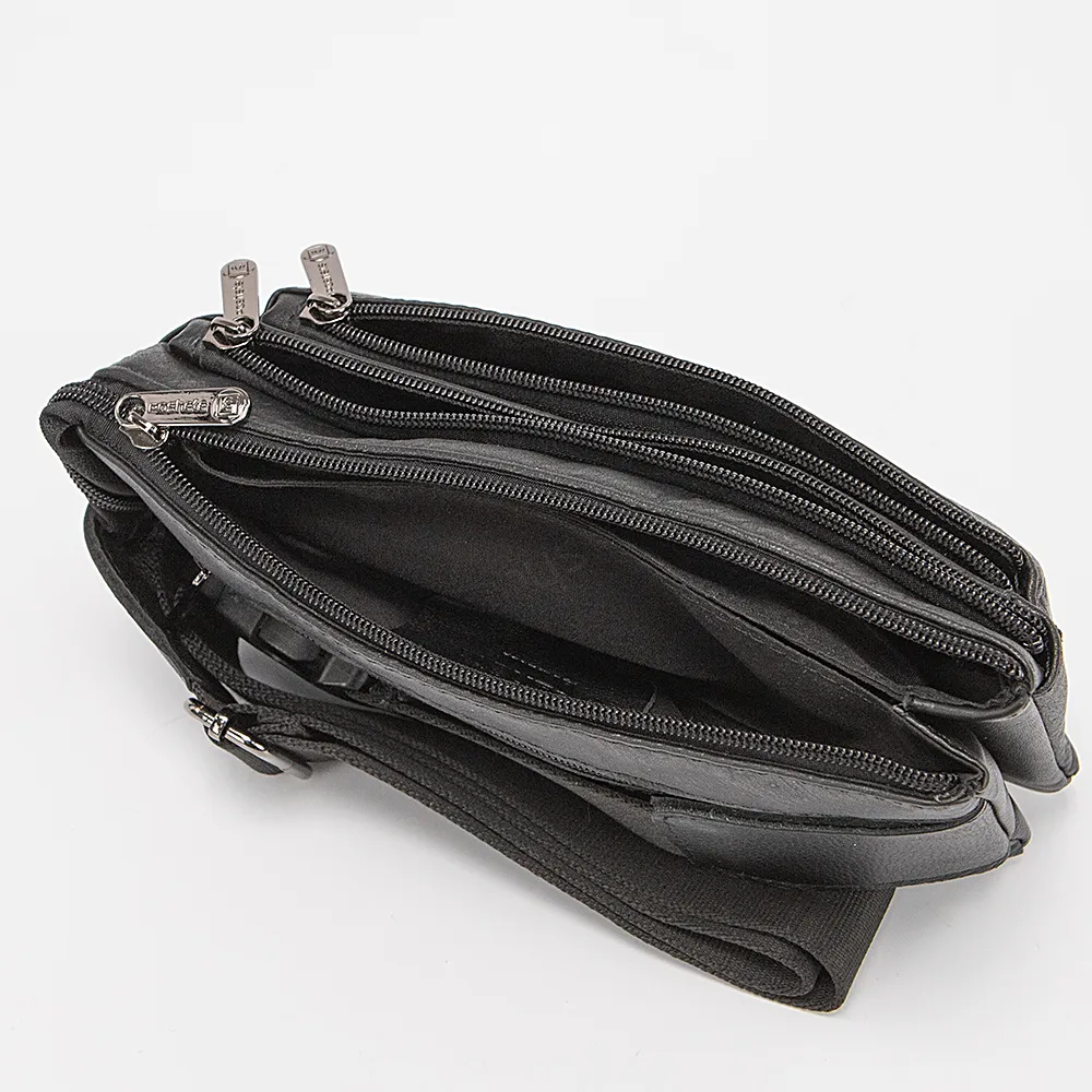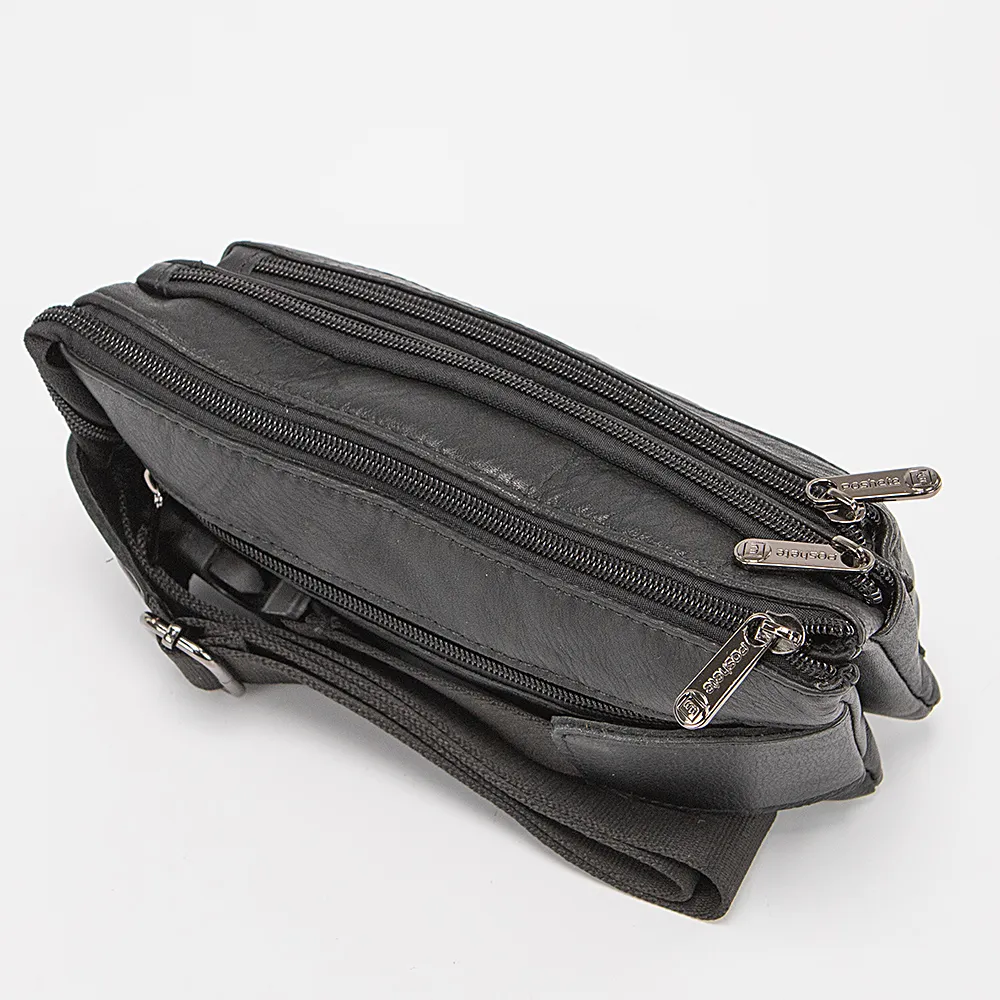 Сумка на пояс от торговой марки Poshete из натуральной кожи черного цвета. Модель с регулируемым поясным ремнем на застежке фастекс. Отделение закрывается молнией. Внутри: текстильная подкладка, перегородка, два отсека, в заднем – карман на молнии. На лицевой стороне – два кармана на молнии.