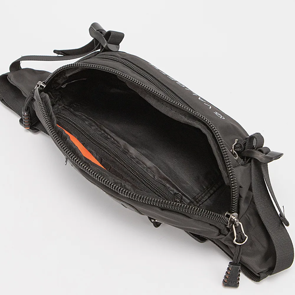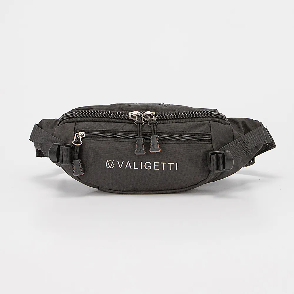 Сумка на пояс от торговой марки Valigetti из практичного текстильного материала черного цвета. Модель с регулируемым поясным ремнем на застежке фастекс. Отделение на молнии. Внутри: текстильная подкладка, карман на молнии. На лицевой и задней сторонах – карман на молнии.