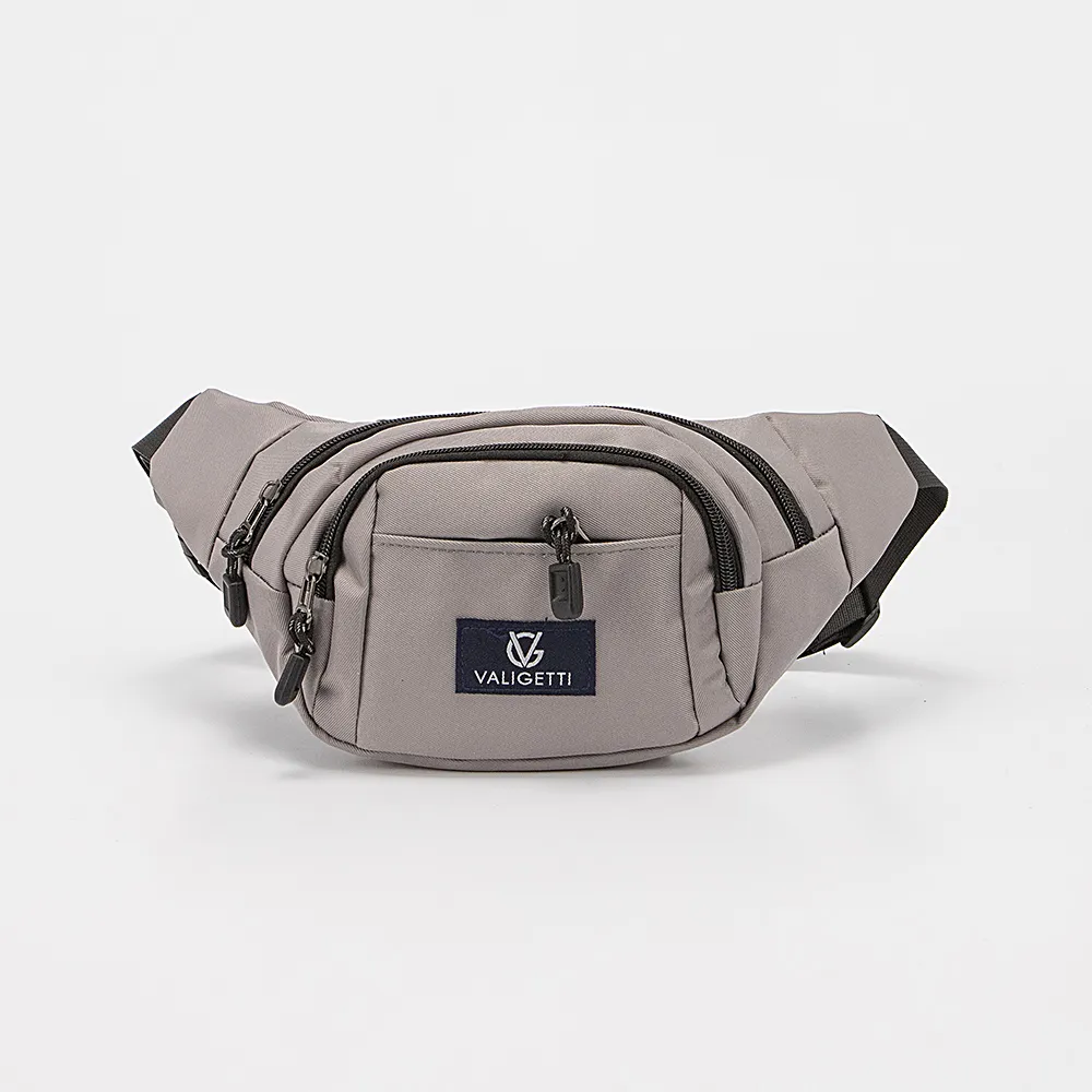 Сумка на пояс от торговой марки Valigetti из текстильного материала серого цвета. Модель с регулируемым ремнем на застежке фастекс. Отделение на молнии, с текстильной подкладкой и накладным карманом. На лицевой стороне – два кармана на молнии. На задней стороне – карман на молнии.