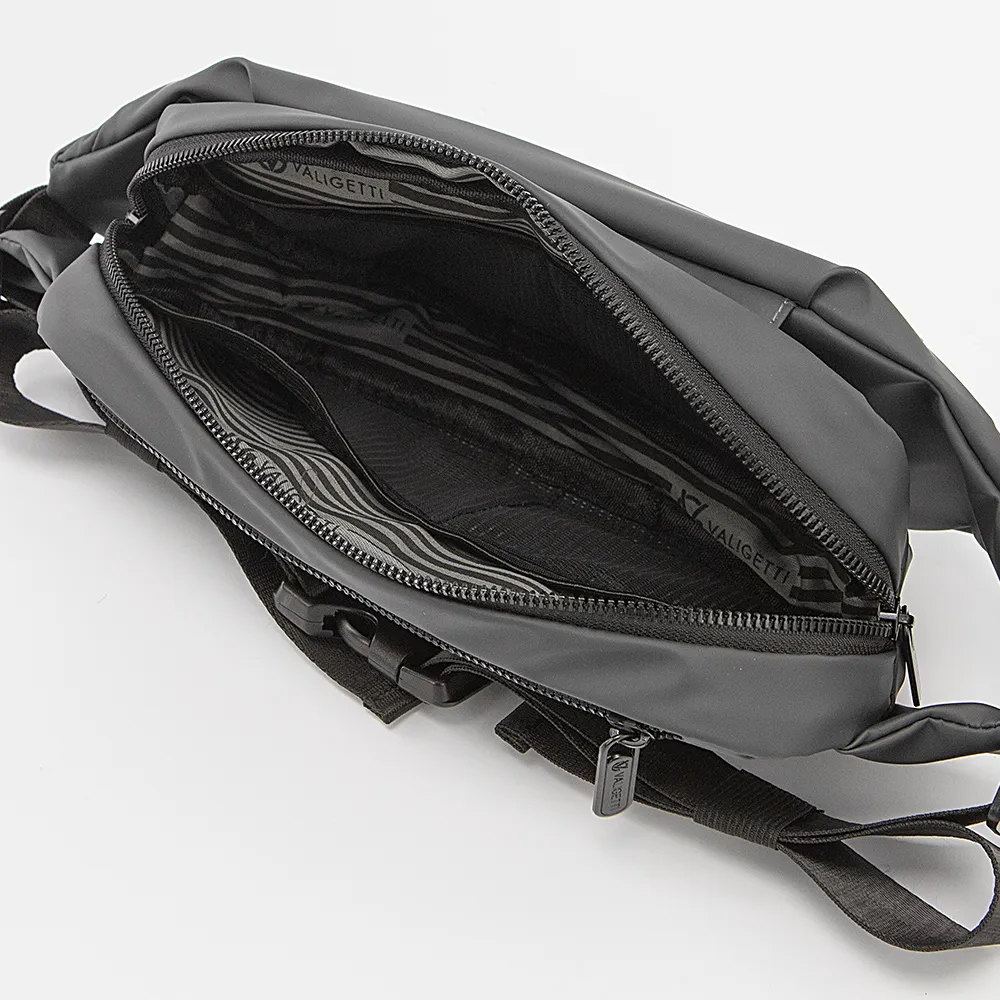 Сумка на пояс от торговой марки Valigetti из прочного практичного непромокаемого текстильного материала цвета хаки. Модель с регулируемым поясным ремнем. Отделение на молнии. Внутри: текстильная подкладка, четыре кармана-сетки. На лицевой и задней сторонах – карман на молнии. Сбоку - место для бутылки.