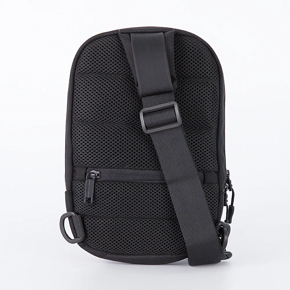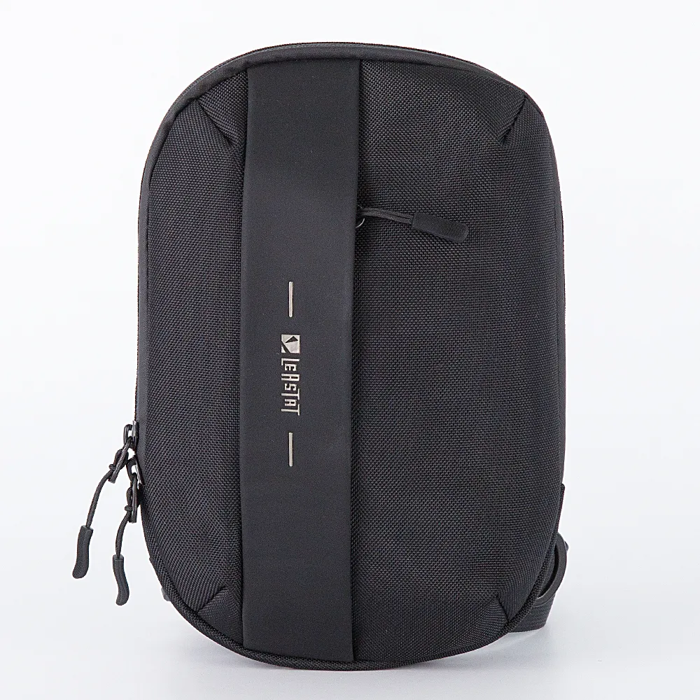 Однолямочный рюкзак от торговой марки Leastat из плотного текстильного материла и искусственной кожи черного цвета. Модель закруглен ной формы с регулируемой плечевой лямкой, которую можно носить как на правом, так и на левом плече. Отделение на молнии с двумя встречными бегунками. Внутри: фирменная подкладка, карман на молнии, накладной карман, органайзер для канцелярских принадлежностей, крепления для ключей. Мягкая спинка с верхним дышащим слоем; имеется карман на молнии. На лицевой стороне – скрытый вертикальный карман на молнии.