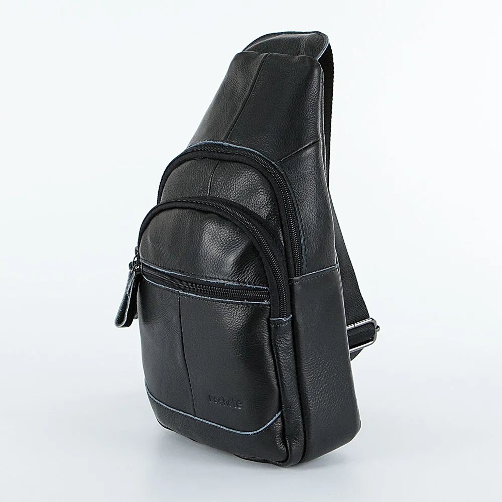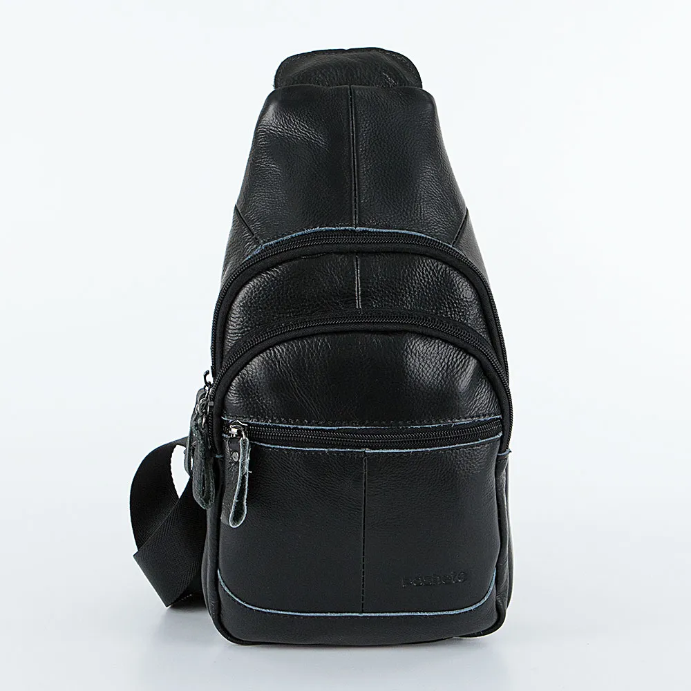 Повседневный мужской рюкзак от бренда Poshete чёрного цвета, с отличным качеством отделки, выполнен из натуральной кожи в сочетании с металлической фурнитурой. Авто документы, ключи и бумажник всегда будут под рукой. Рюкзак компактного размера, отлично подходит путешественникам, носится на регулируемой атласной лямке через плечо. Снаружи три кармана, один сзади без застёжки и два спереди на молниях. Основное отделение на молнии, внутри текстильная подкладка и запасной кармашек. Сбоку имеется металлический люверс, через который можно продеть наушники.