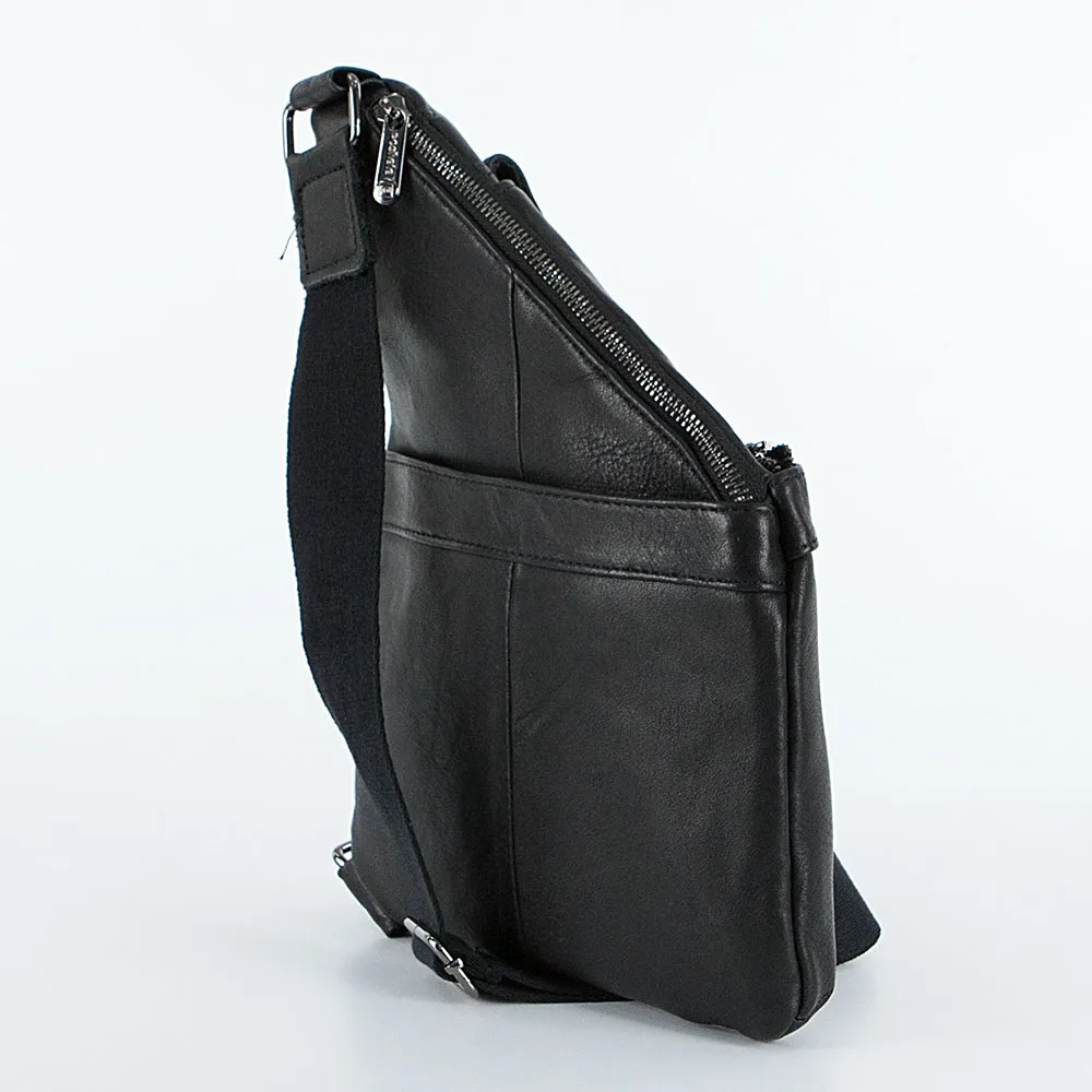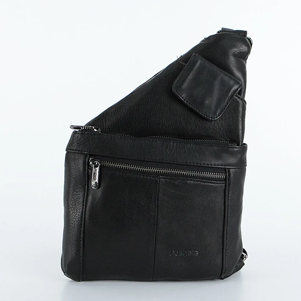 Сумка-кобура от торговой марки Poshete из натуральной кожи черного цвета. Модель с регулируемой плечевой лямкой. Отделение на молнии. Внутри: фирменная подкладка, карман на молнии. На лицевой стороне – накладной карман с клапаном на магнитной кнопке, два кармана на молнии. На задней стороне – накладной карман на магнитной кнопке.