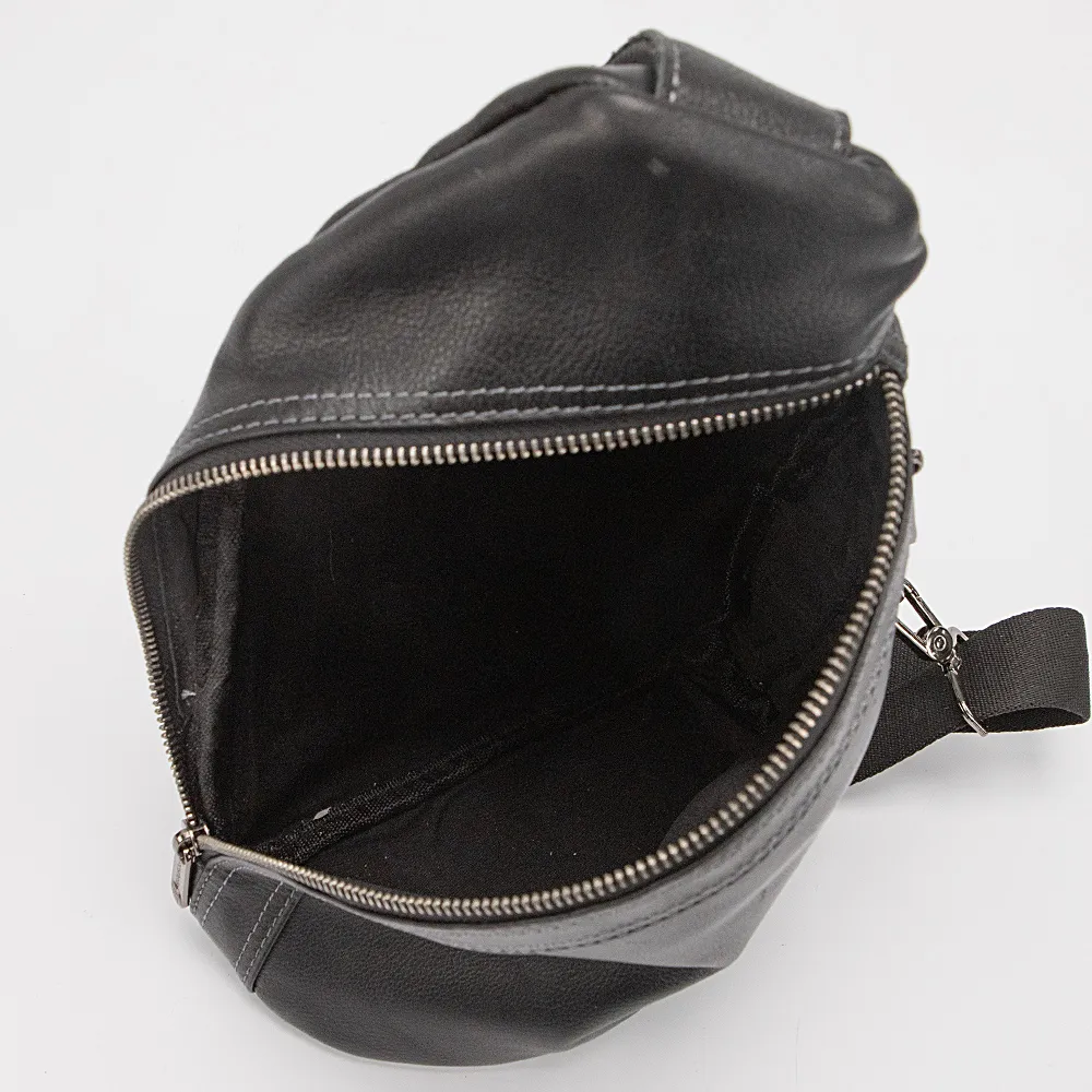 Однолямочный рюкзак от торговой марки Poshete из натуральной кожи черного цвета. Модель с регулируемой плечевой лямкой на карабине, что позволяет носить рюкзак как на левом, так и на правом плече. Отделение на молнии с боковым открытием. Внутри: фирменная подкладка, карман на молнии. На лицевой стороне – вместительный боковой карман на молнии. На спинке – вертикальный карман на молнии.