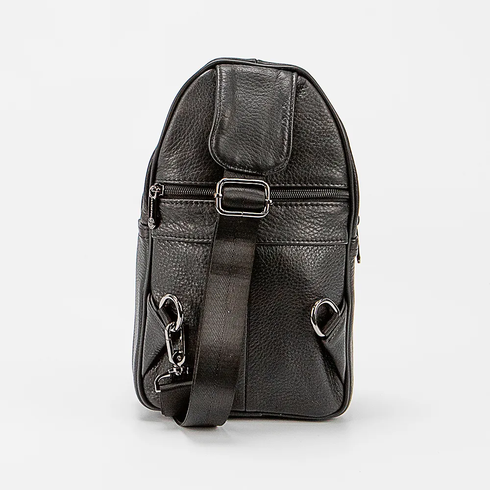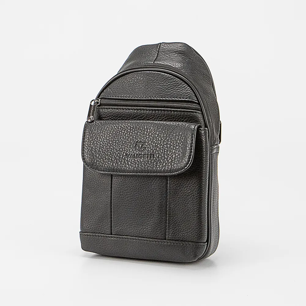 Однолямочный рюкзак от торговой марки Valigetti из натуральной кожи черного цвета. Модель с регулируемой плечевой лямкой. Отделение на молнии. На лицевой стороне – карман на молнии, накладной карман с клапаном. На спинке – карман на молнии.