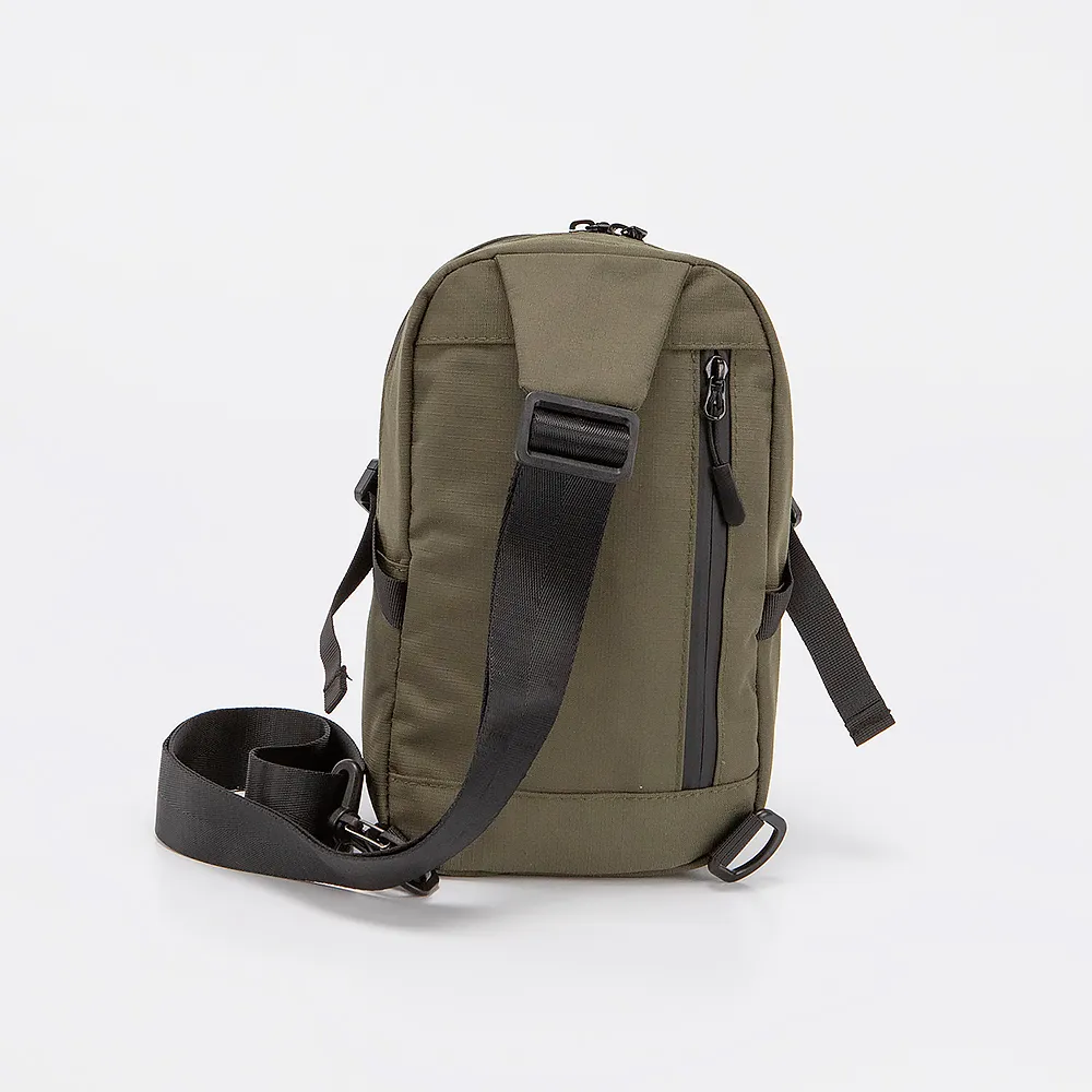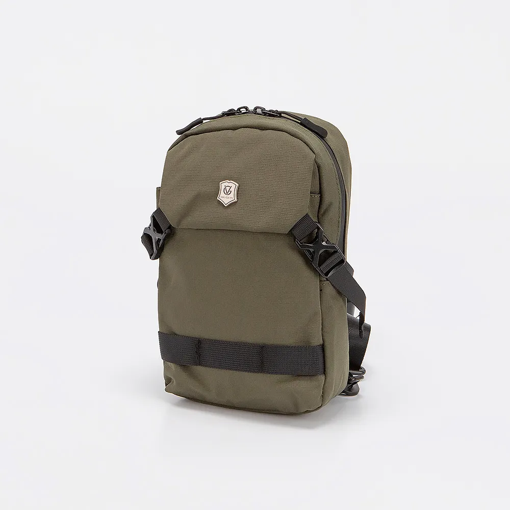 Однолямочный рюкзак от торговой марки Valigetti из текстильного материала цвета хаки. Модель с регулируемой плечевой лямкой. Отделение на молнии. Внутри: текстильная подкладка, карман на молнии. На лицевой стороне - карман с клапаном, закрывающимся на застежки фастекс. На задней стороне - вертикальный карман на молнии.