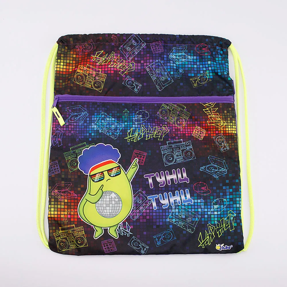 Мешок для обуви от торговой марки Оникс из текстильного материала. Декорирован оригинальным ярким принтом с изображением авокадо. Мо дель с дополнительным карманом на молнии и вентилируемой сетчатой вставкой. Затягивается шнурками, выполняющими роль плечевых лямок. Удобный практичный аксессуар для сменной обуви, спортивных тренировок, прогулок и походов.