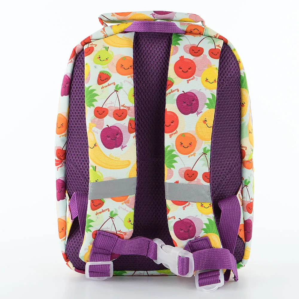 Рюкзак от торговой марки Ecotope kids из плотного практичного полиэстера. Декорирован ярким принтом с фруктами. Модель с лямкой-переноской, плотной ручкой и регулируемыми плечевыми лямками с нагрудными фиксаторами для распределения нагрузки и светоотражателями, повышающими безопасность в темное время. Отделение на молнии с текстильной подкладкой. Внутри: накладной карман. На лицевой стороне – накладной карман на молнии. Спинка с дышащим верхним сетчатым слоем.