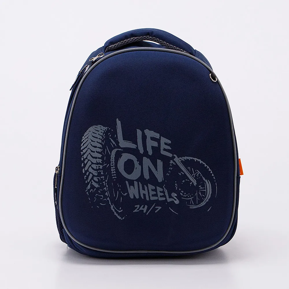 Ранец от торговой марки Ecotope из практичного текстильного материала. Формованная лицевая панель декорирована принтом с изображением мотоцикла и надписью: «Life on wheels»; имеется кольцо для крепления брелока. Модель с лямкой-переноской и мягкой набивной ручкой, широкими регулируемыми плечевыми лямками со светоотражателями, повышающими безопасность в темное время, и с нагрудными ремнями, равномерно распределяющими нагрузку. Спинка с анатомическими вставками с дышащим верхним сетчатым слоем. Два отделения на молнии, с текстильной подкладкой. В основном отделении – накладной карман с уплотненной стенкой. В переднем отделении – органайзер. По бокам – карман-сетка и светоотражающая лента. Дно оснащено прорезиненными ножками для устойчивости и защиты от износа.