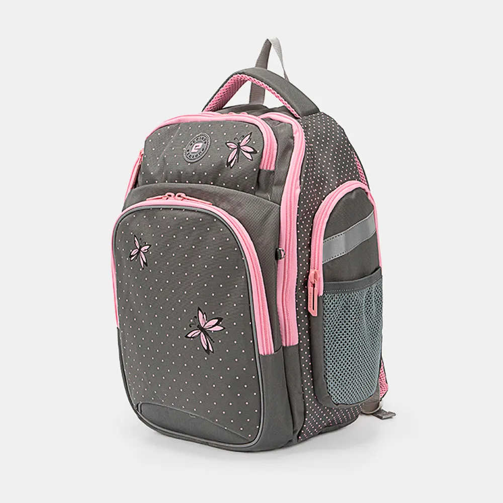 Рюкзак от торговой марки Ecotope из практичного текстильного материала в сочетании серого и розового цвета. Декорирован принтом «в горошек» с изображением бабочек. Модель с лямкой-переноской, мягкой удобной набивной ручкой, регулируемыми плечевыми лямками более прочной конструкции в форме майки, с нагрудными фиксаторами для равномерного распределения нагрузки. Спинка с анатомическими вставками и дышащим верхним сетчатым слоем. Отделение на молнии. Внутри: текстильная подкладка, накладной карман с уплотненной стенкой и фиксатором на липучке. На лицевой стороне – вместительный карман на молнии; внутри: органайзер для хранения мелких предметов и канцелярии. В верхней части – карман-пенал. По бокам – карман на молнии, карман-сетка. Спереди, по бокам и на спинке имеются светоотражающие элементы, повышающие безопасность в темное время.