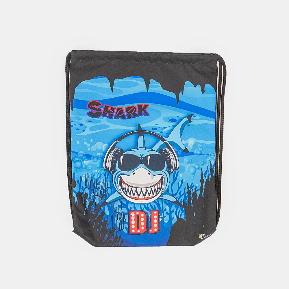 Мешок для обуви от торговой марки Оникс из практичного текстильного материала. Декорирован принтом с изображением акулы. Отделение затягивается веревками, выполняющими также роль плечевых лямок.